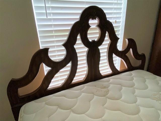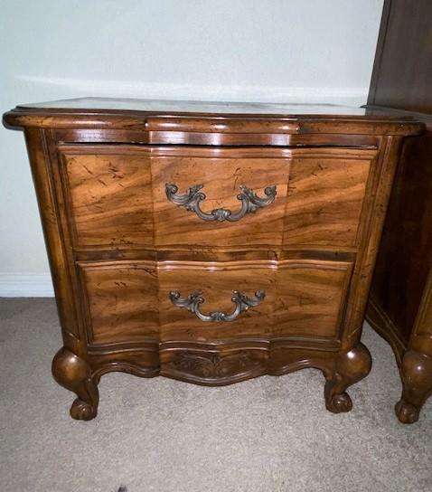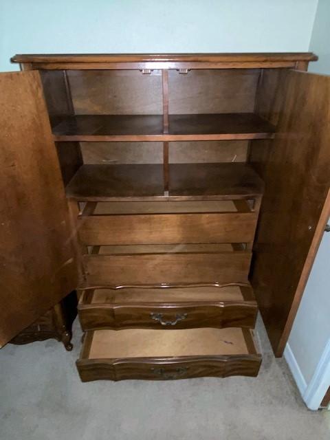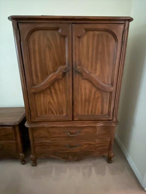 Includes night stand, armoire, and bed. Headboard is full/queen. Mattress is full. Measurement: 60"H x 39"W x 19"D (armoire)