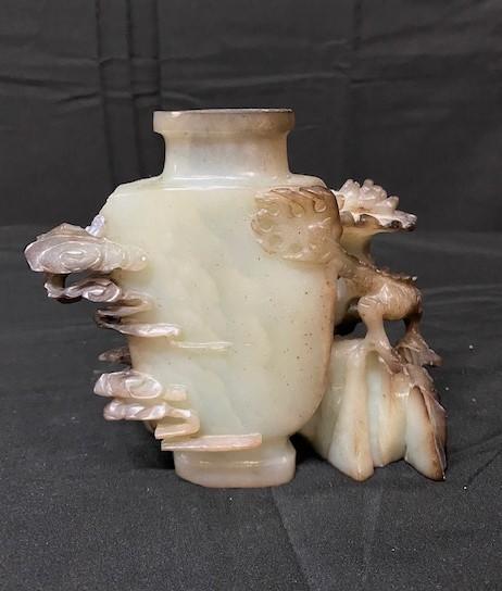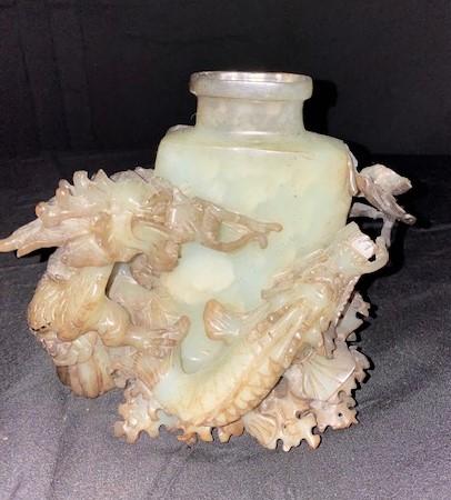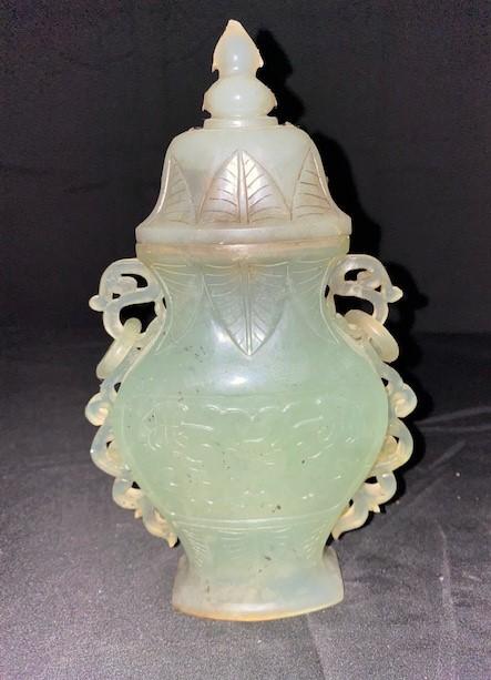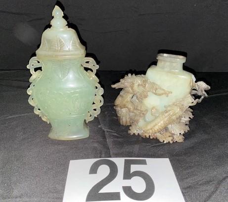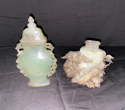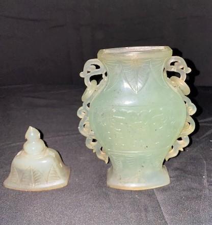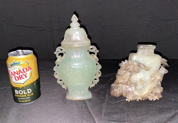 Believed to be vases. One covered with lid. Dragons on one. Both are missing pieces of jade. Measurement: 8"H x5"W (Cover vase) 5 1/2"W x 5"H (dragon vase)