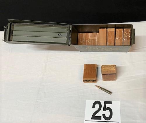 114 boxes. 14 rounds per box. Total rounds: 196. With metal ammo box. Estimated weight of lot: 10lbs. Measurement: 11" x 7"