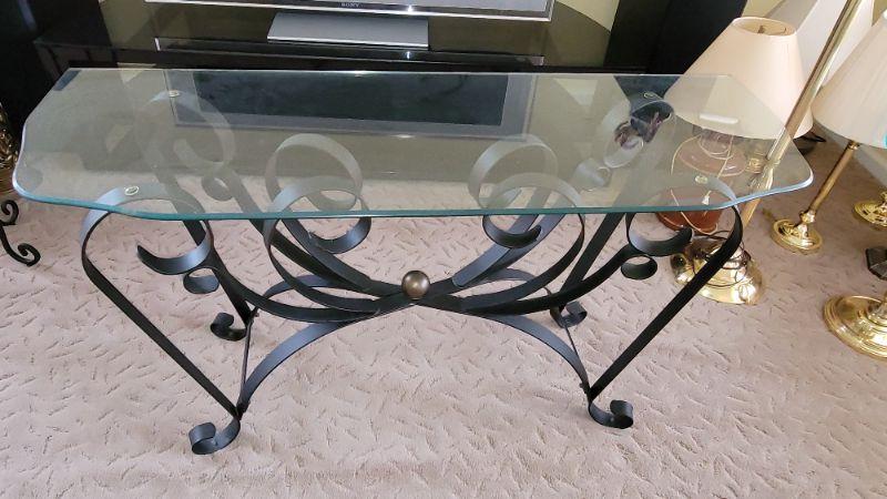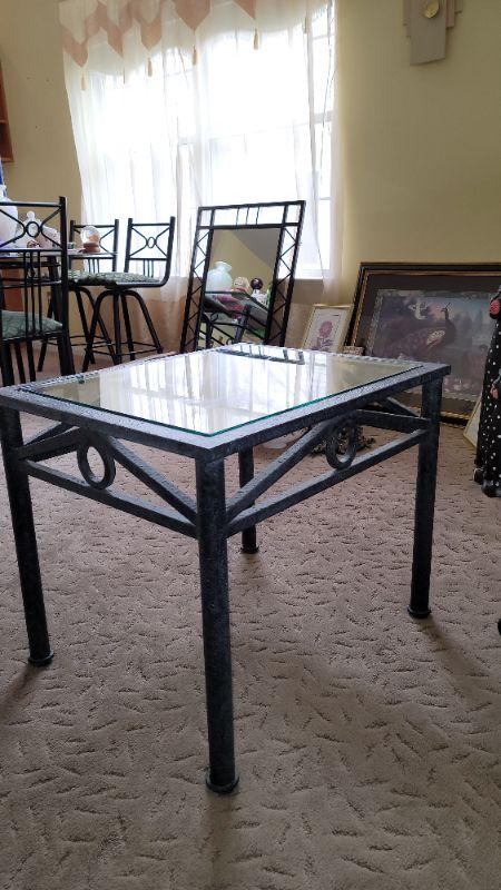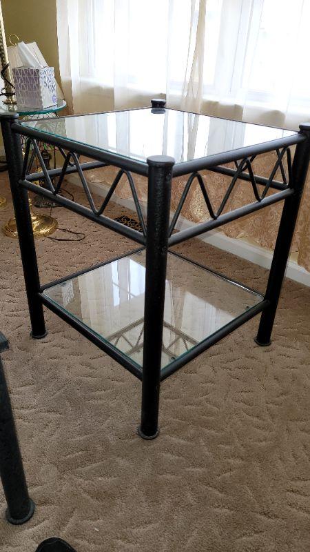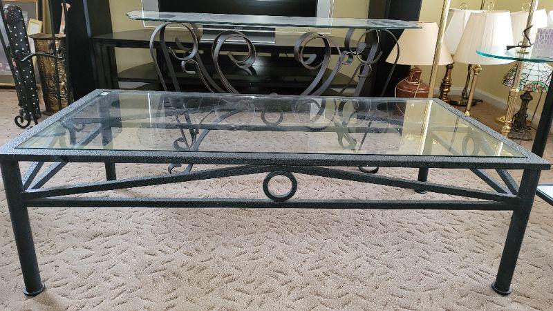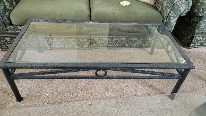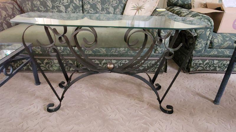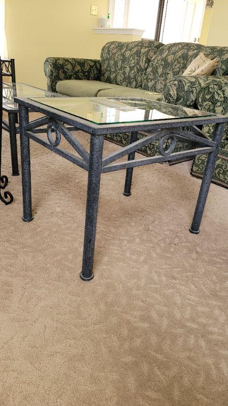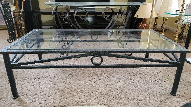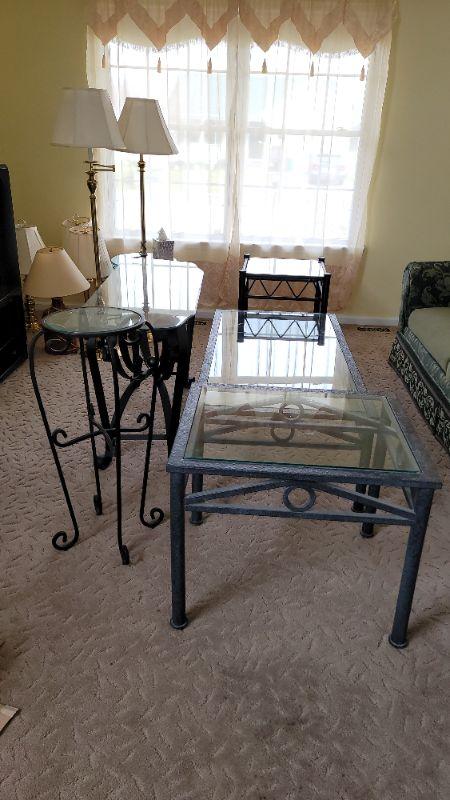Lot27: Metal plant stand, glass top sofa table, glass top coffee table and two glass top end tables