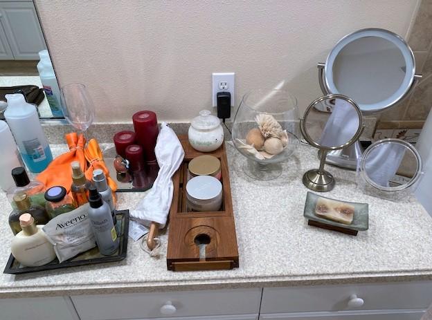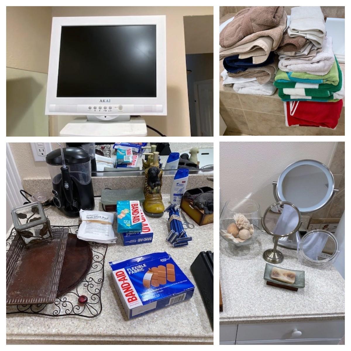 Includes towels, vanity mirrors, sundries, Akai flat screen TV, and more.