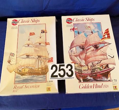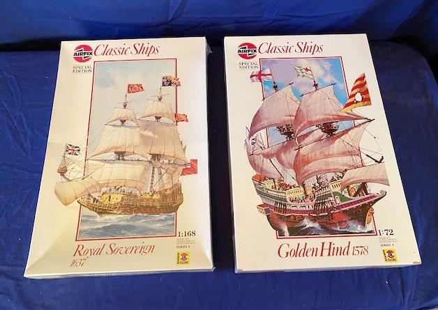 "Royal Sovereign" (1:168 scale, factory sealed) and "Golden Hind" (1:72 scale). NOS. Estimated weight of lot: 10 lbs. Measurement: 20"L x 13"W x 6"D