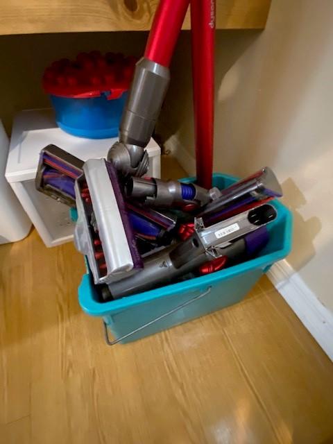Includes Dyson accessories, area rugs, pet supplies, dog toys, fluids, stainless trash cans, floor scrubbers, and more. Central vacuum is not included. Washer and dryer are not included.