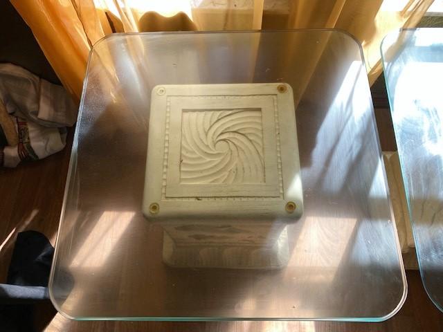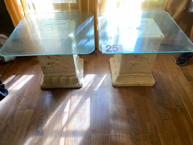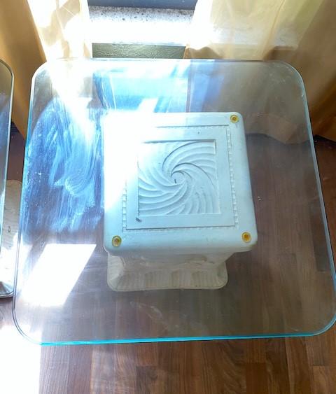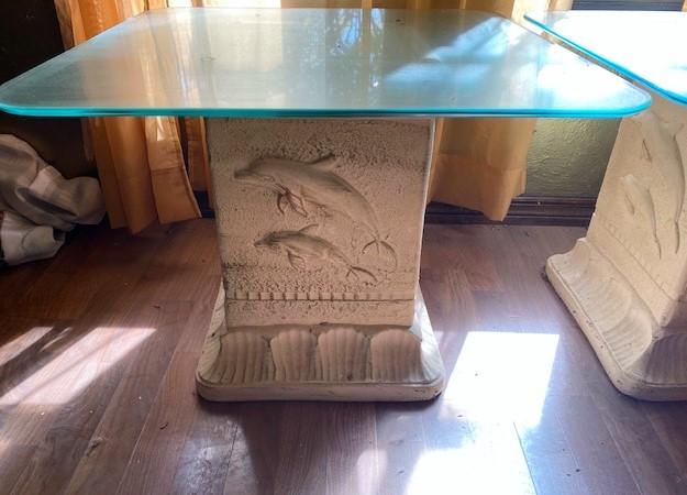 Glass tops. Some scuffs on bases. Castcrete bases. Measurement: 26"W x 26"D x 21"H (with glass)