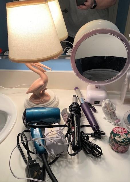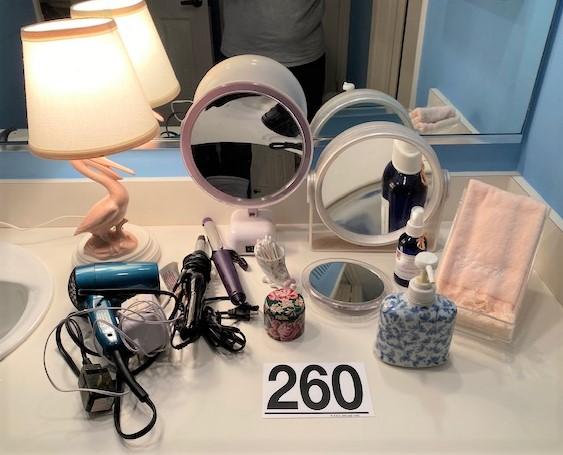 3 mirrors, curling iron, hair dryer, pelican lamp & more. Measurement:17"H (lamp) 9 1/2" diameter (largest mirror)
