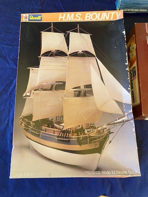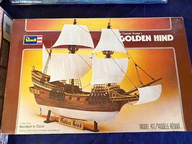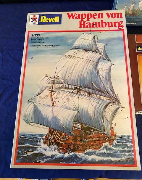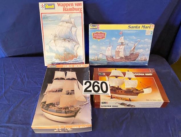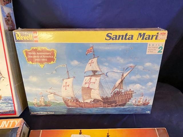 NOS. "Wappen Von Hamburg" (1:133 scale), "HMS Bounty" (13 3/4"L), "Golden Hind" (1:200 scale), and "Santa Maria" (1:90 scale). Estimated weight of lot: 10 lbs. Measurement: 16"L x 12"W x 11"D
