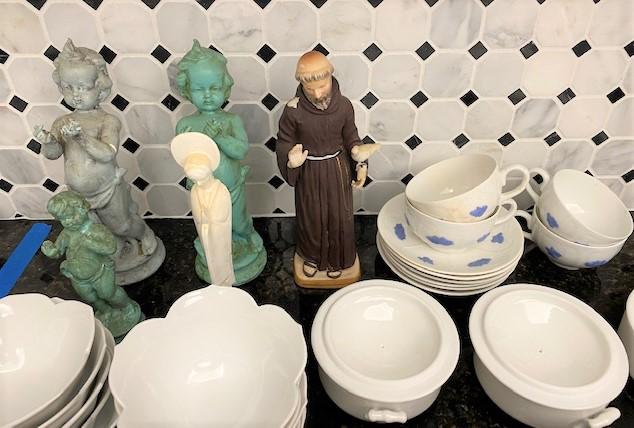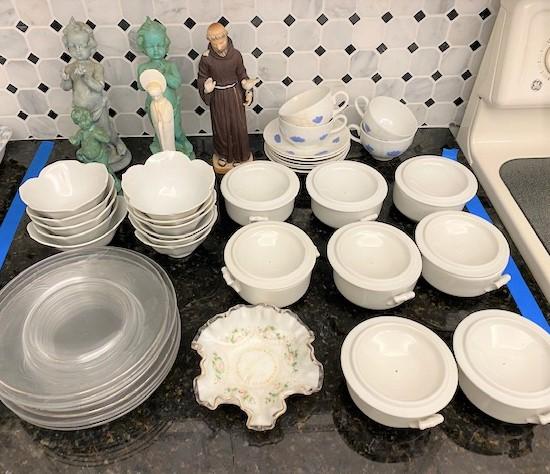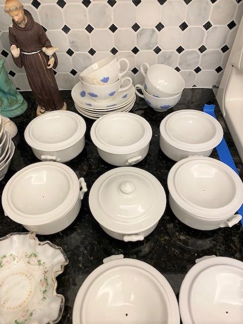Includes: painted Fenton silver crest, French onion soup crocks, lotus bowls, & more. Measurement: 9 1/2"H (tallest) x 8"diameter (widest)