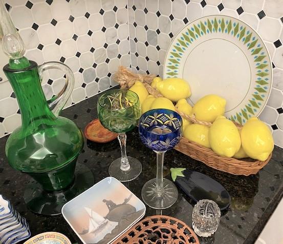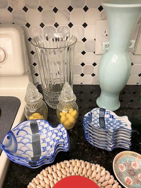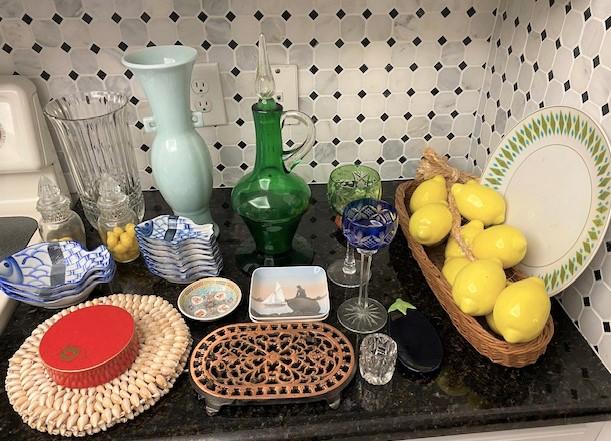 Includes: cut to clear crystal trivets, small dishes & more. Measurement: 16"H (tallest) 18"W (widest)