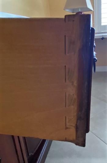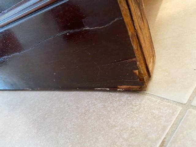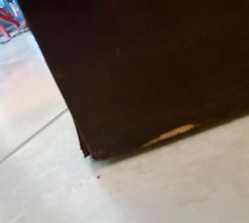 Two doors are rounded. Has some surface scratches. Some veneer is coming off (pictured). Measurement: 60"L x 35"H x 19"D