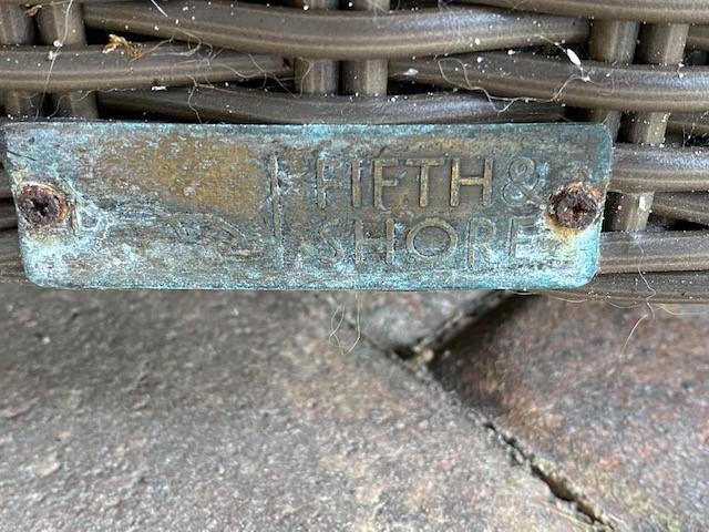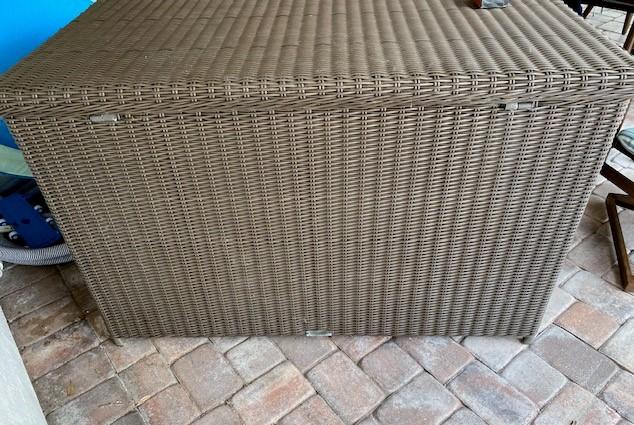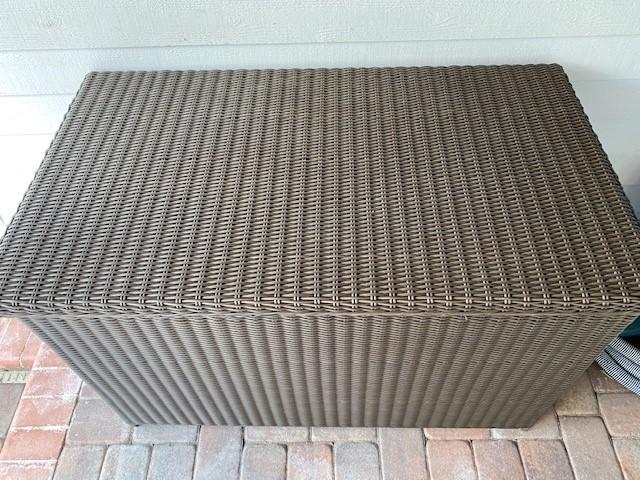 All weather wicker construction. Includes contents. No apparent damage to wicker. Measurement: 55"L x 32"D x 36"H