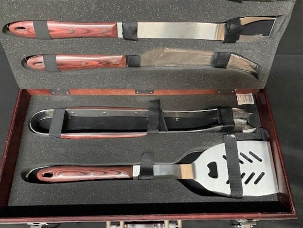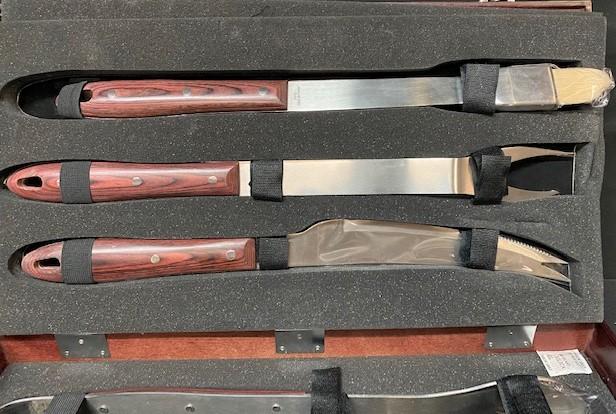 Includes, meat fork, knife, tongs, spatula & more. In carry case. Measurement: 21 1/2"L x 11"W