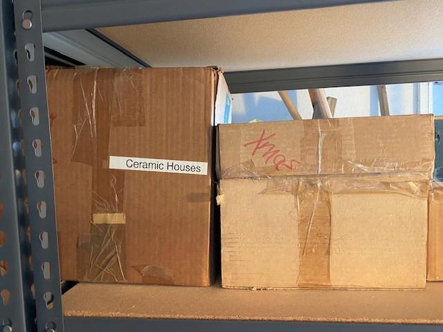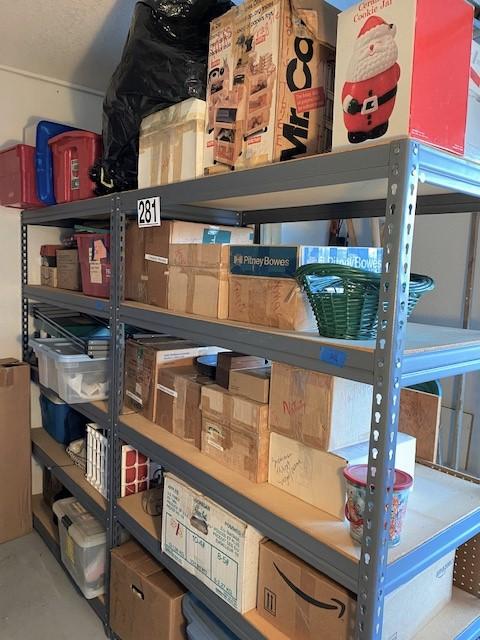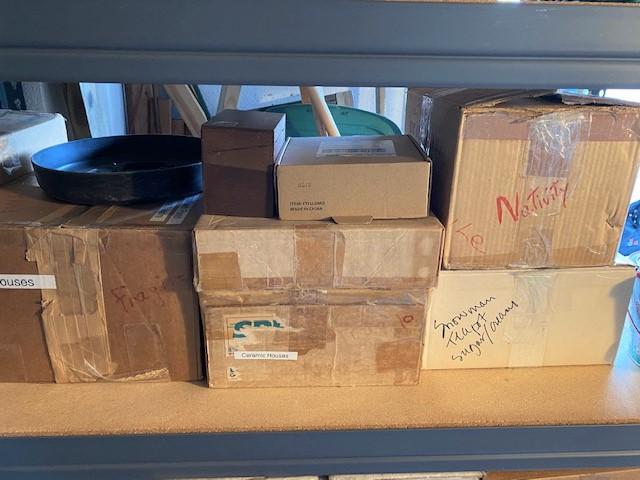 Manger scene, milk glass, ceramic village houses, cookie jar & more. Shelving unit NOT included. Estimated weight of lot: lbs. Measurement: