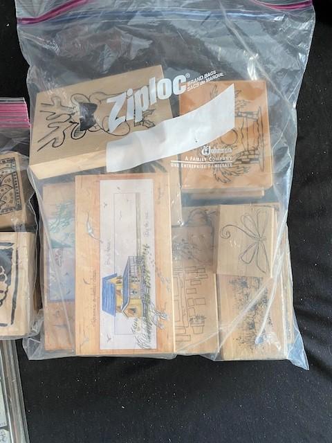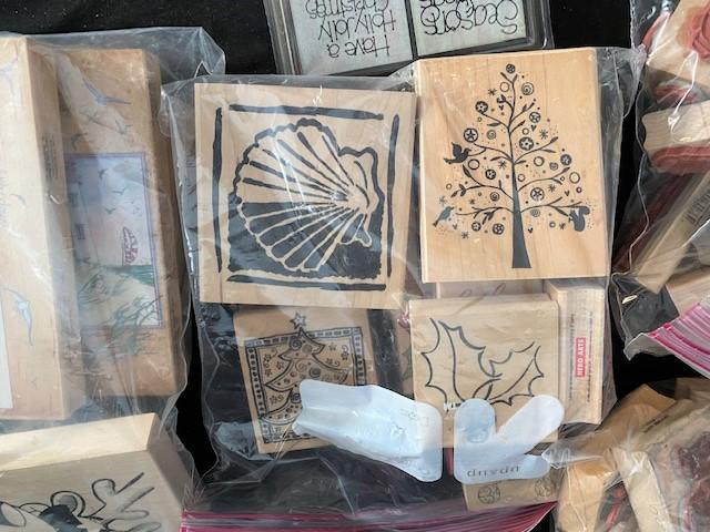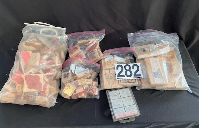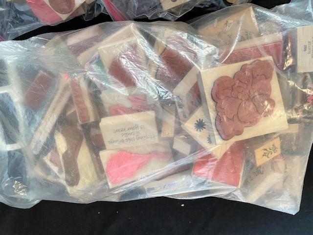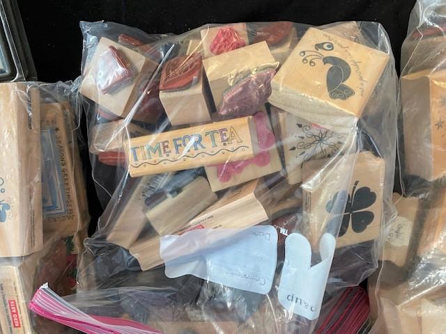 50+ rubber stamps. Estimated weight of lot: 15lbs. Measurement: 21" x 15" x 18"