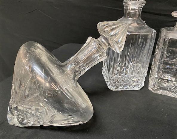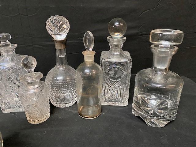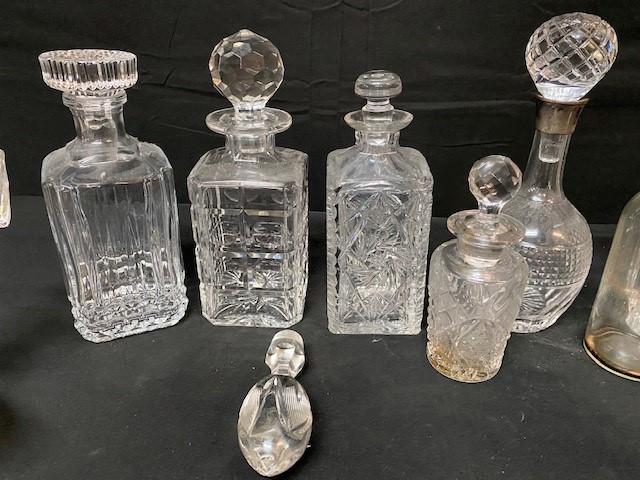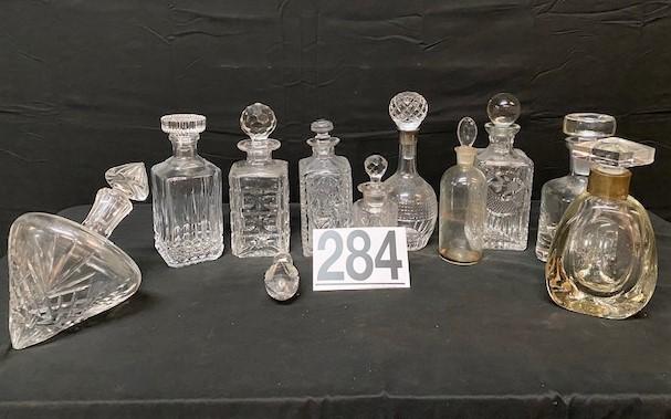 10 decanters & an extra stopper. Measurement: 12"L x 7"diameter (slanted decanter)