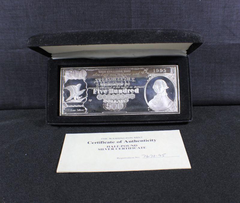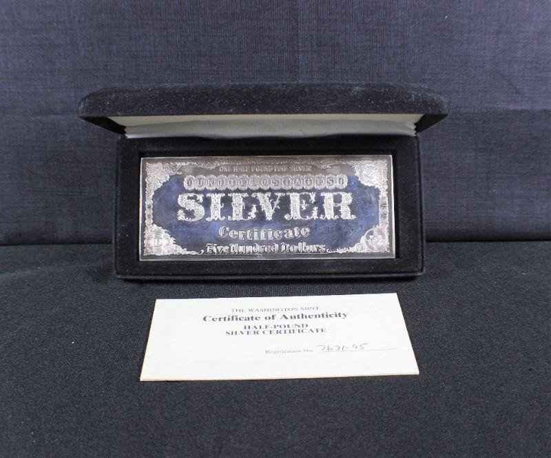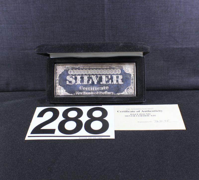 LOT#288J: Half Pound Silver Certificate Silver Bullion
