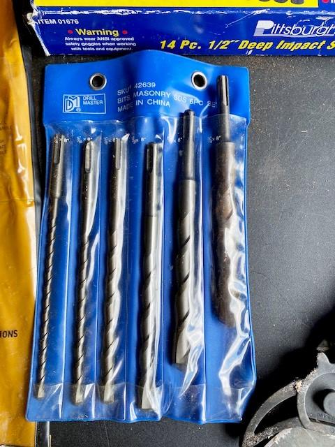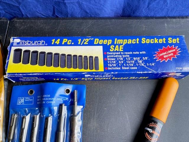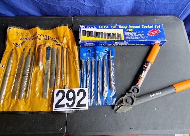 Includes deep impact socket set, professional file set, masonry bit set, and lopper.
