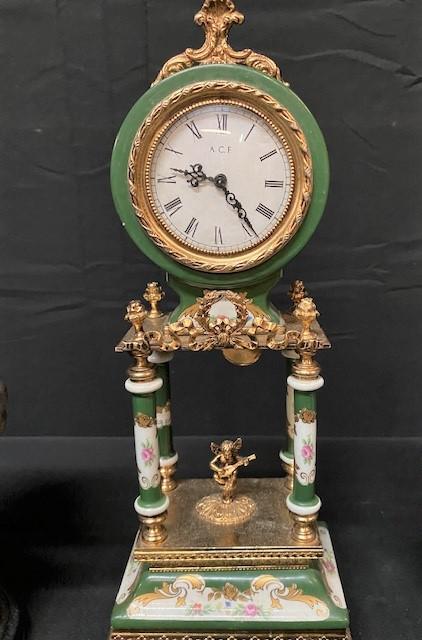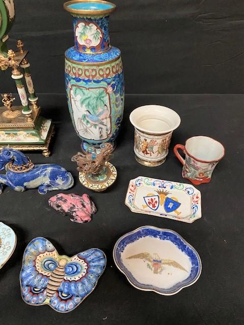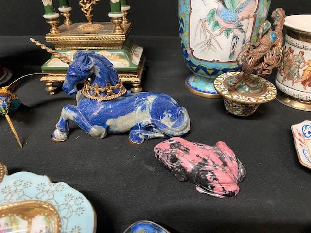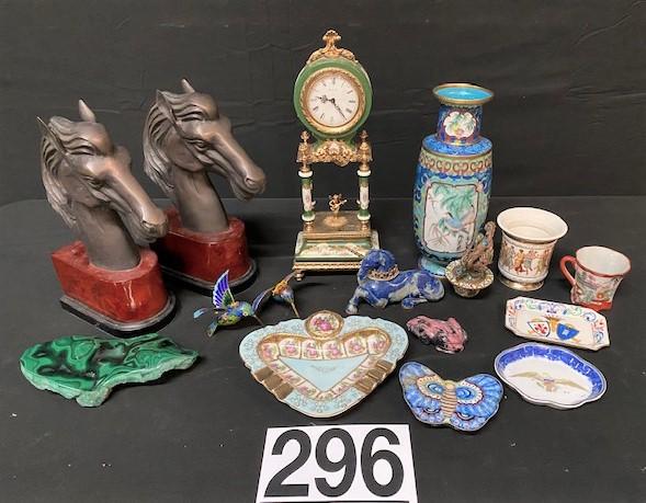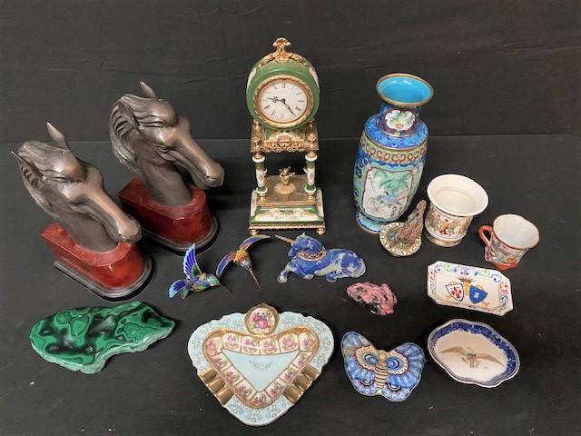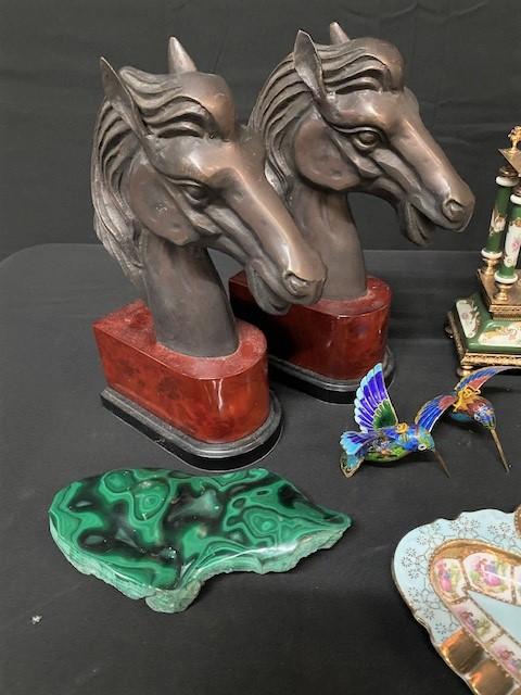 Includes: horse bookends, clock, vase, malachite (polished on one side, raw on other), cloisonne birds, jasper frog, unicorn, & more. Measurement: 13"H (clock) 7 1/2"W (horse bookend; each)