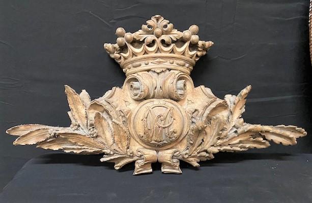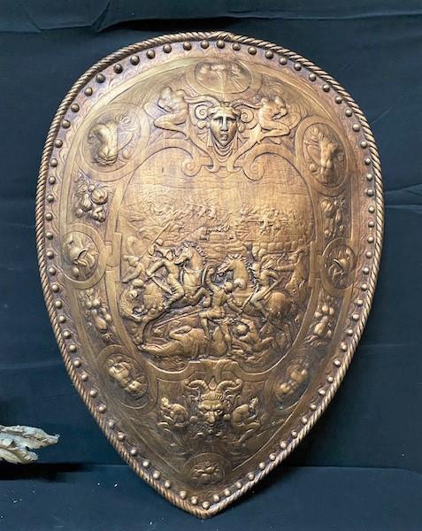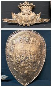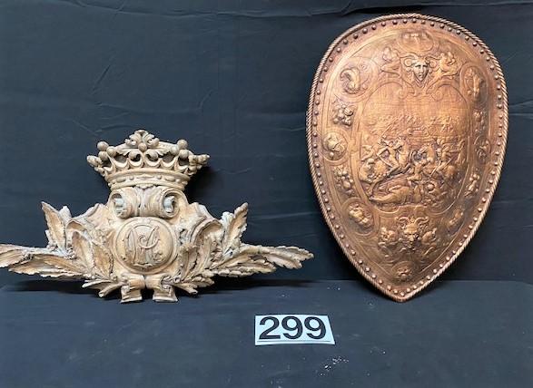 One is a carved Corbel; one is a copper colored wooden shield. Measurement: 24"L x 17 1/2"W (shield)