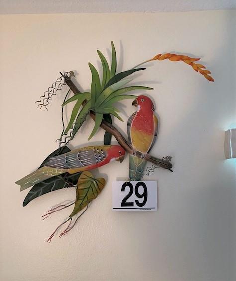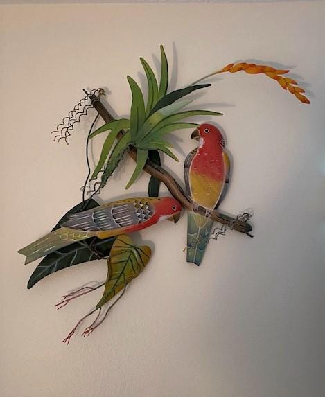 Metal and wood. Parrot motif. Measurement: 24"L x 25"H