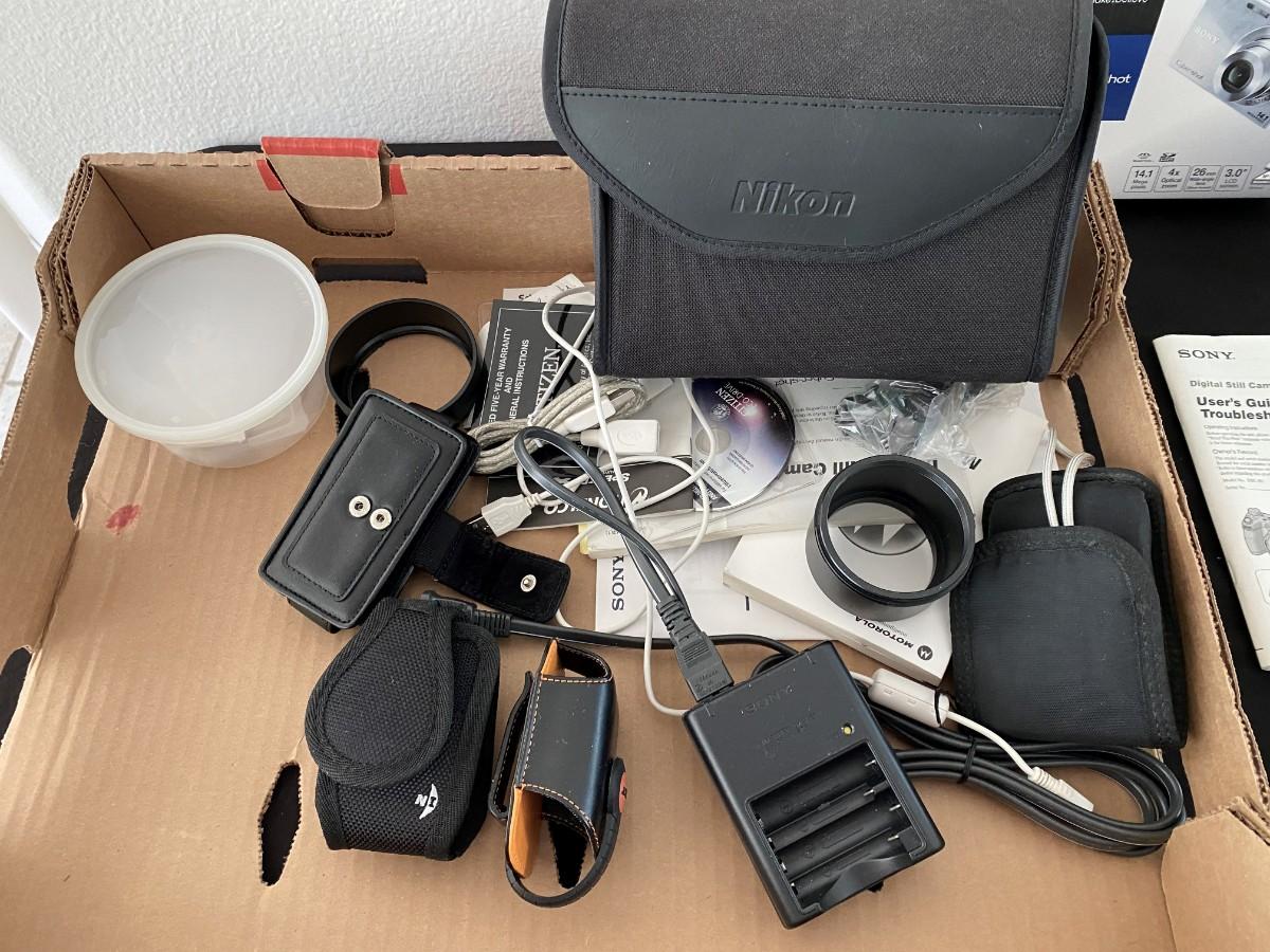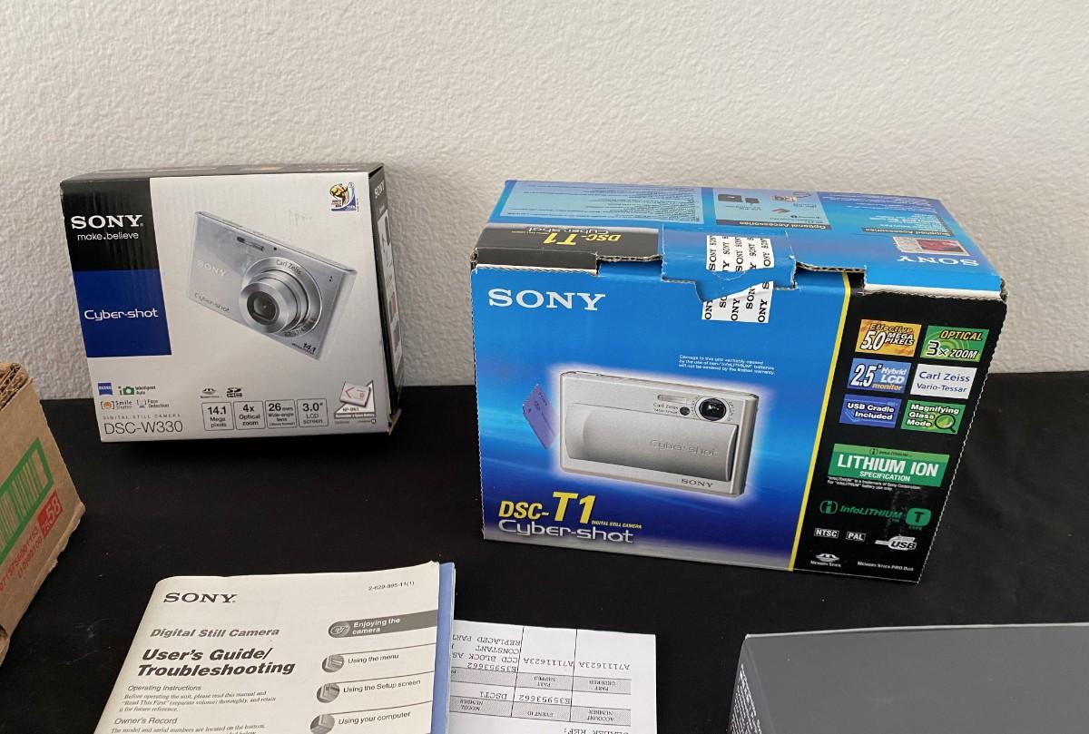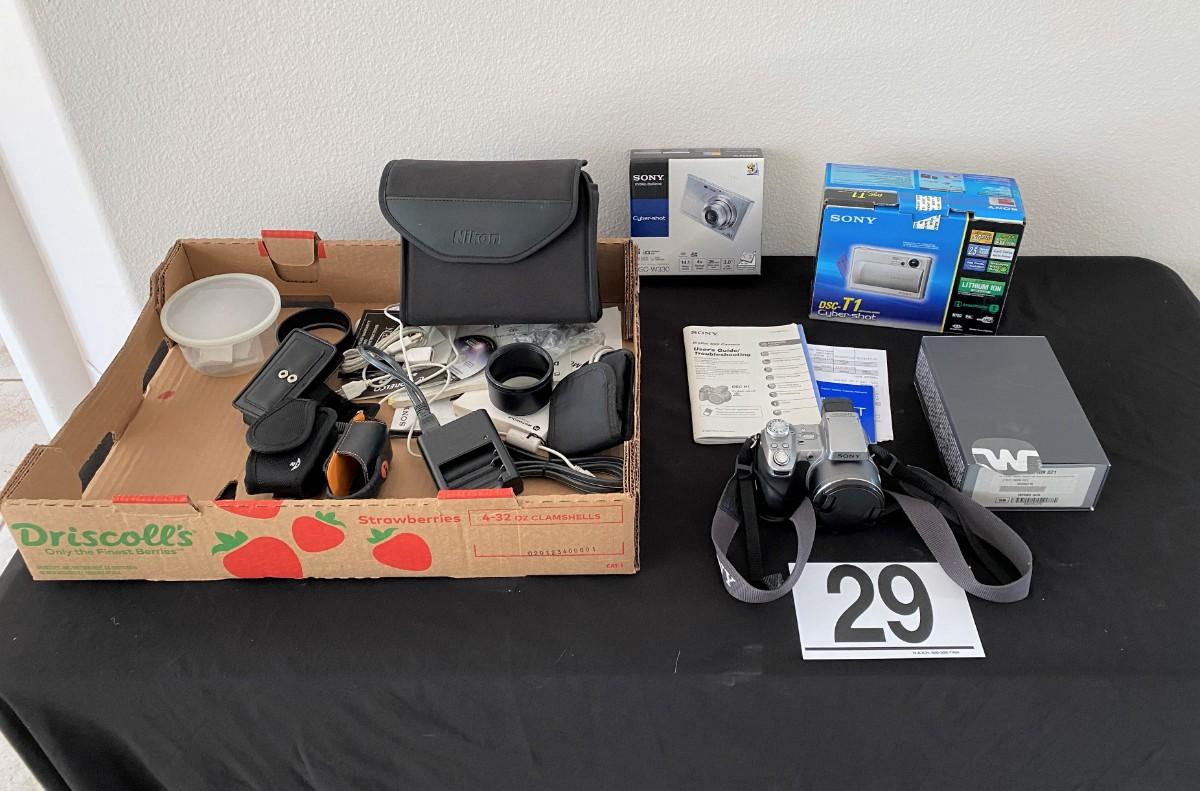 Includes two Sony Cyber-Shot cameras, Sony Super Steady Shot camera, and accessories.