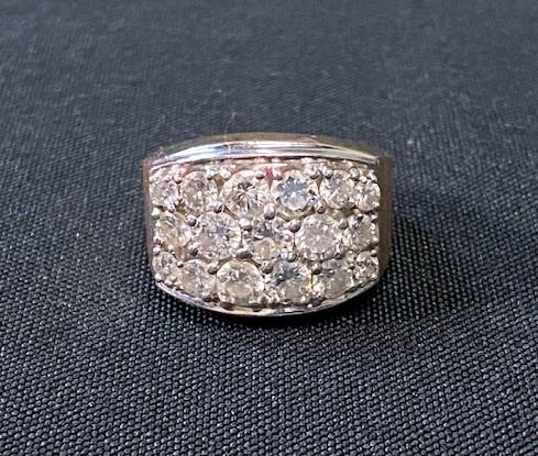 Size 11.75. Largest stone(s) approximately 4.75mm. "Diamonds" confirmed only with Gemoro Ultra Tester 3. Total of 17 diamonds