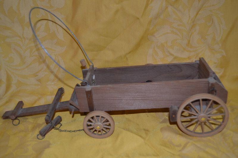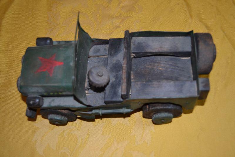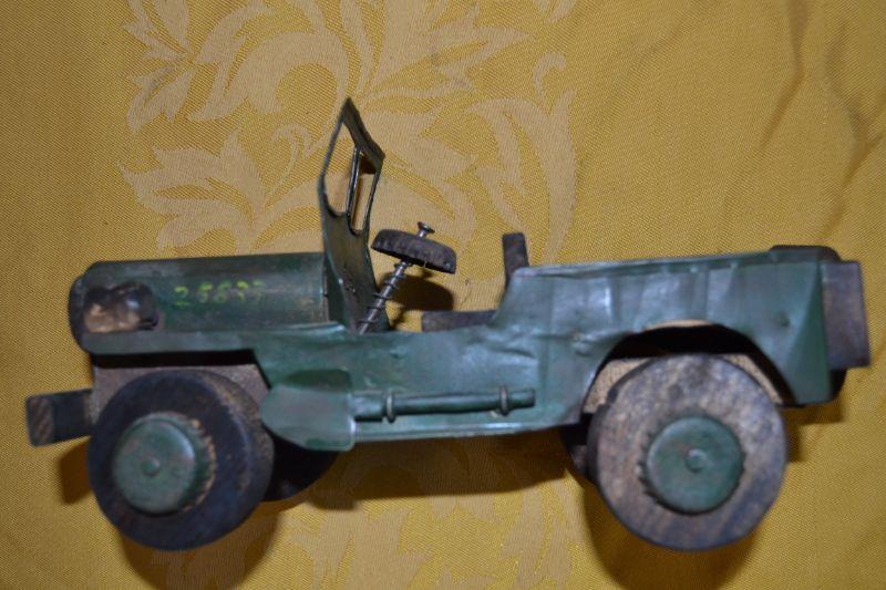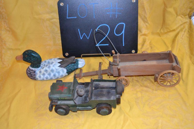 A hand painted mallard, a handmade wagon (missing cover), and a handmade thin metal military jeep... Walk into a bar!