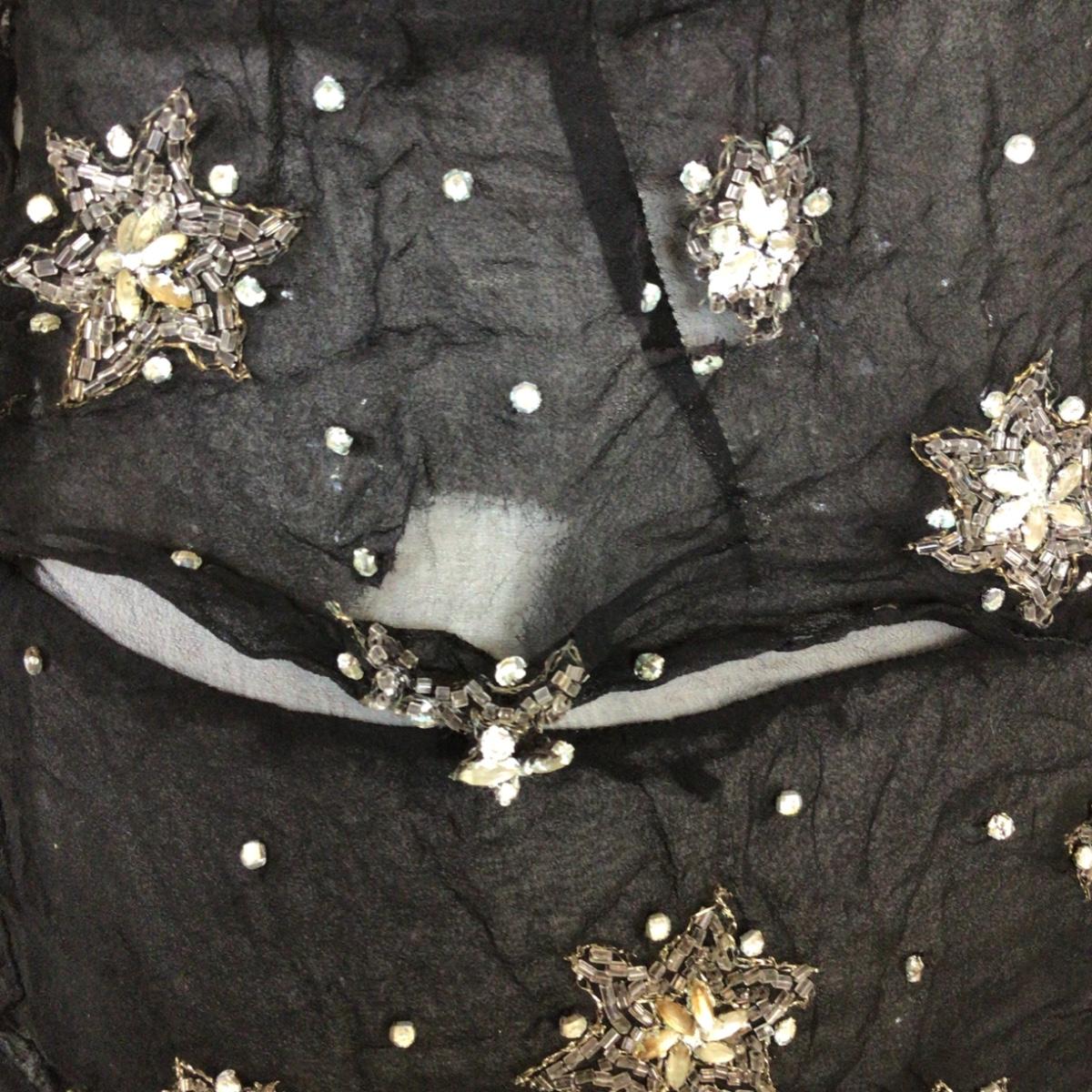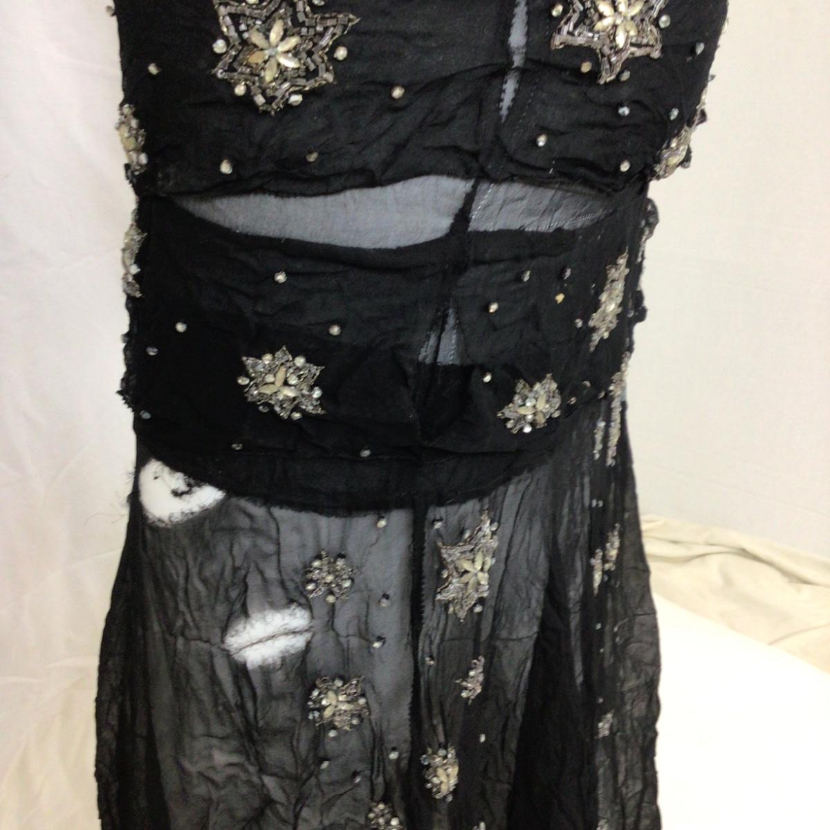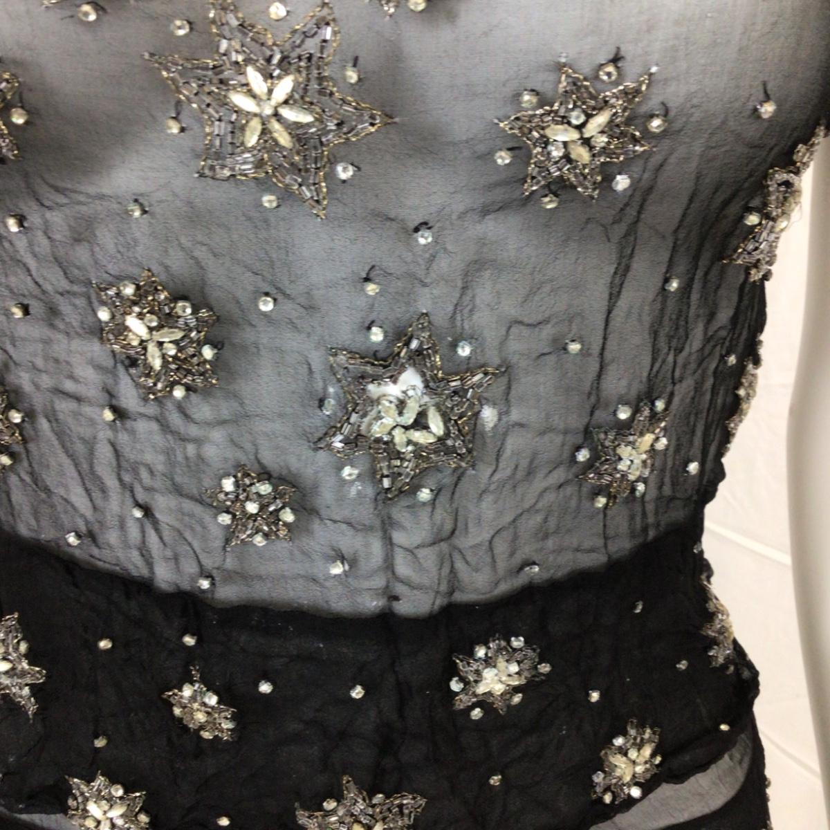 The dress is light delicate Crepe material with stitched and beaded star design. . There is some wear and slight damage, please see photos as they are part of the description. Hand sewn tag (no name)