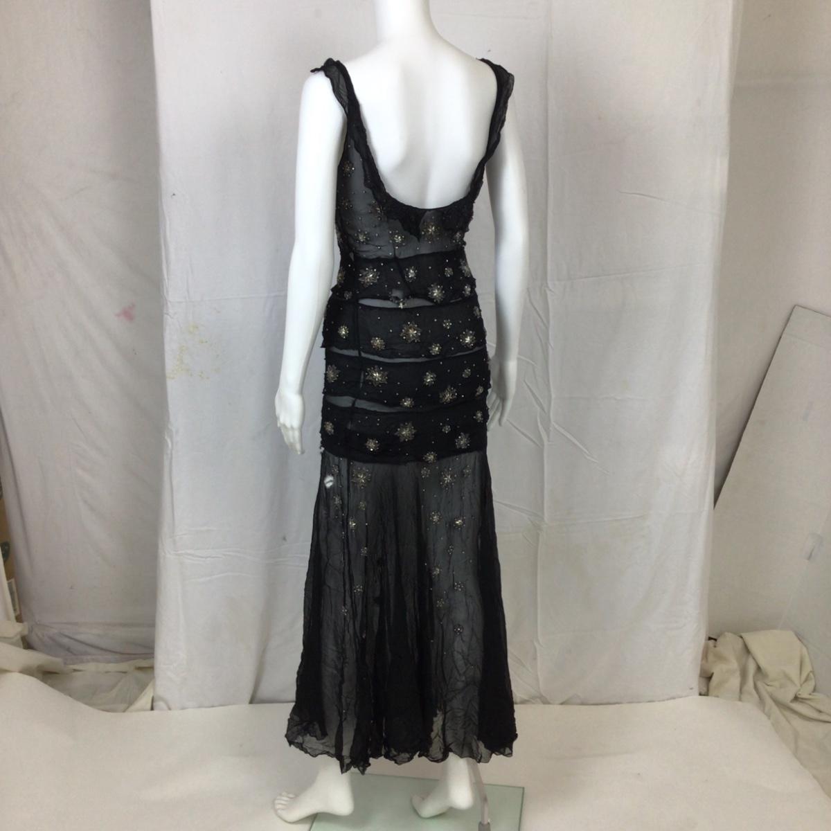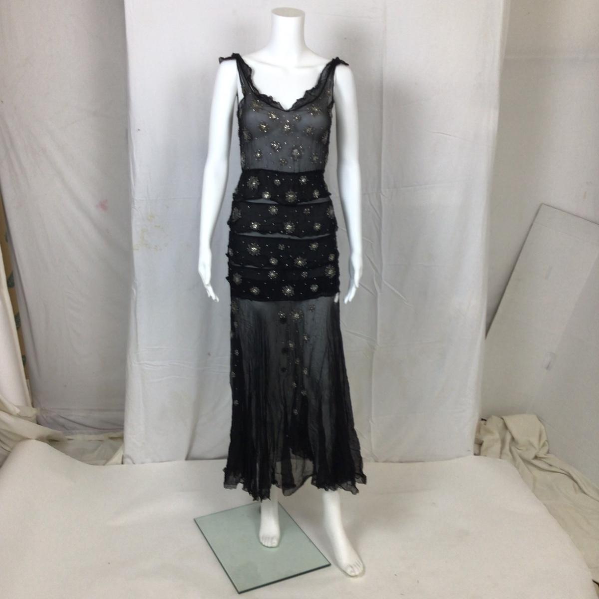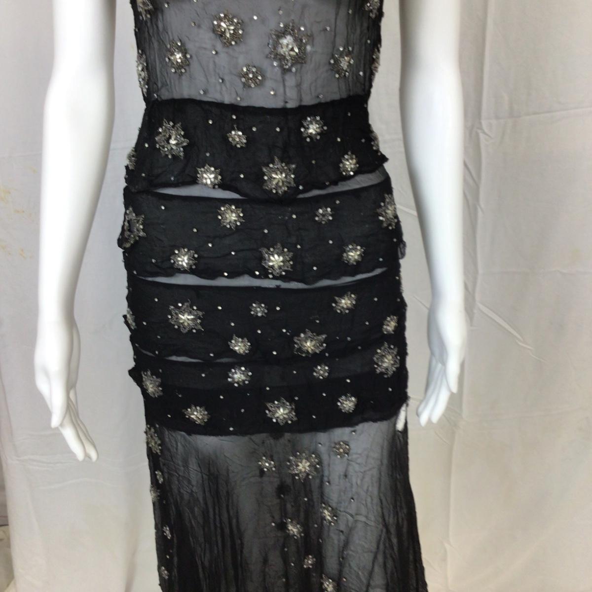 The dress is light delicate Crepe material with stitched and beaded star design. . There is some wear and slight damage, please see photos as they are part of the description. Hand sewn tag (no name)