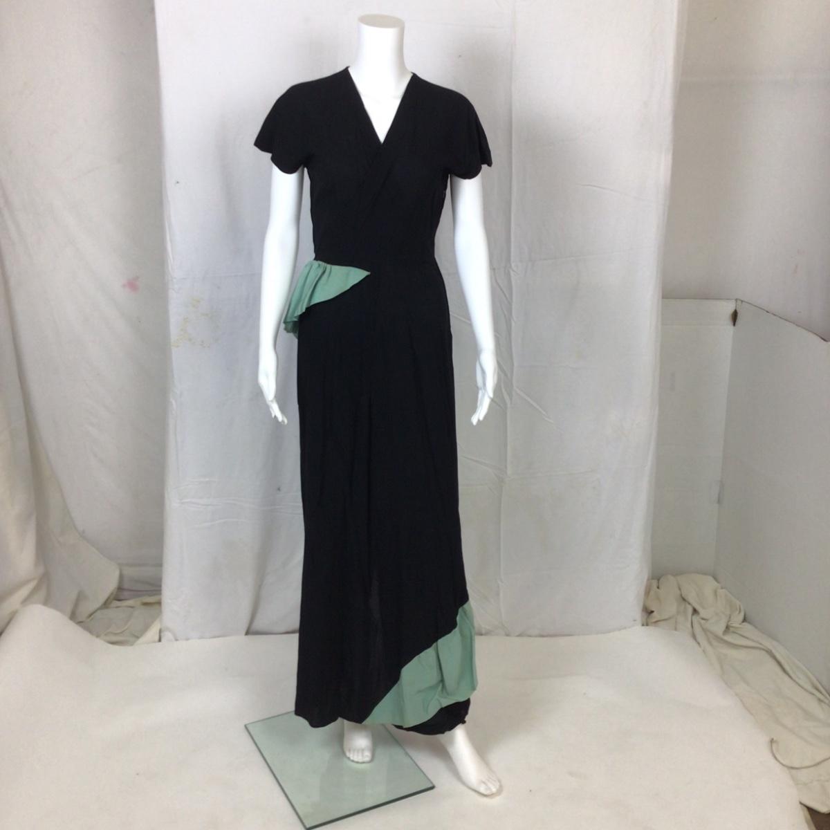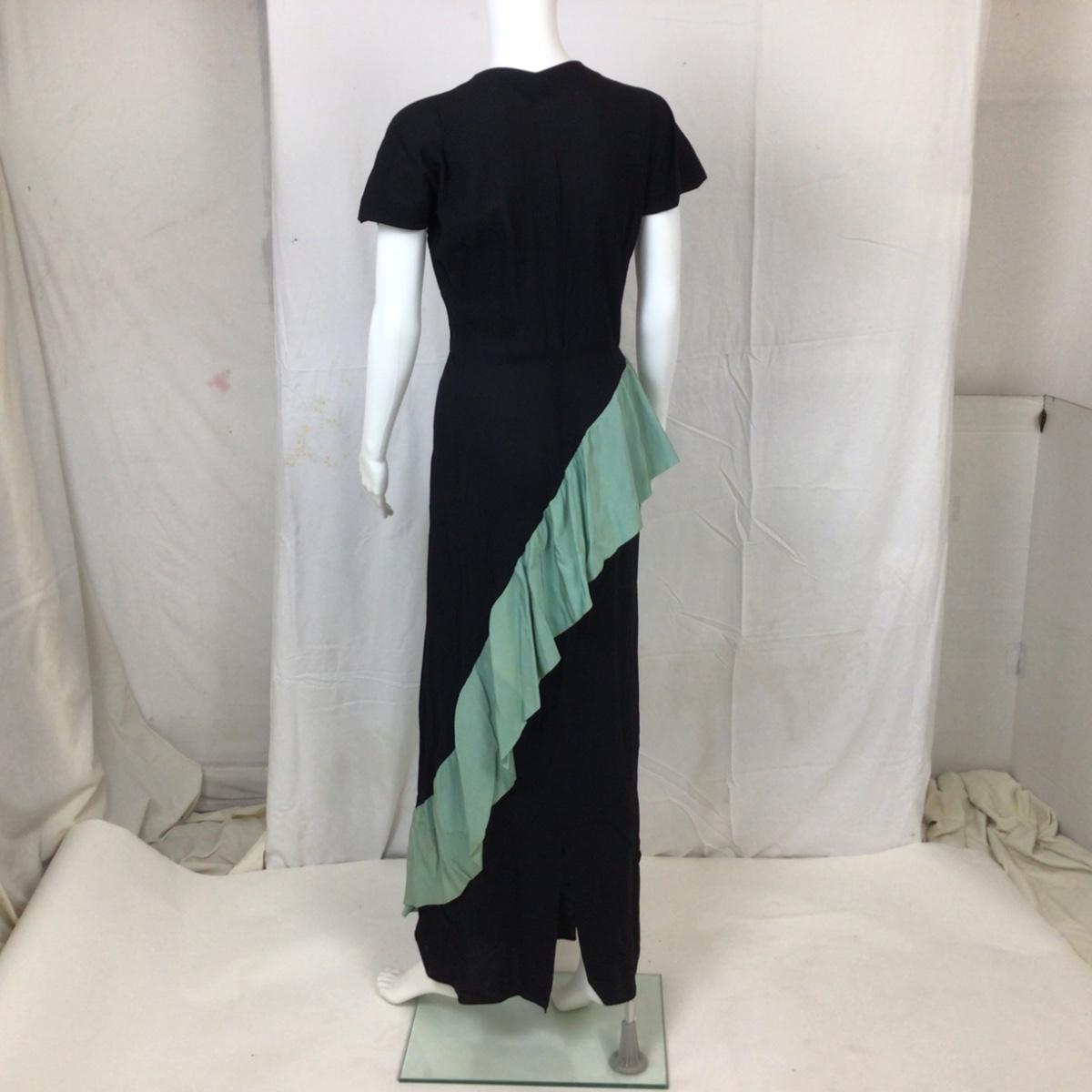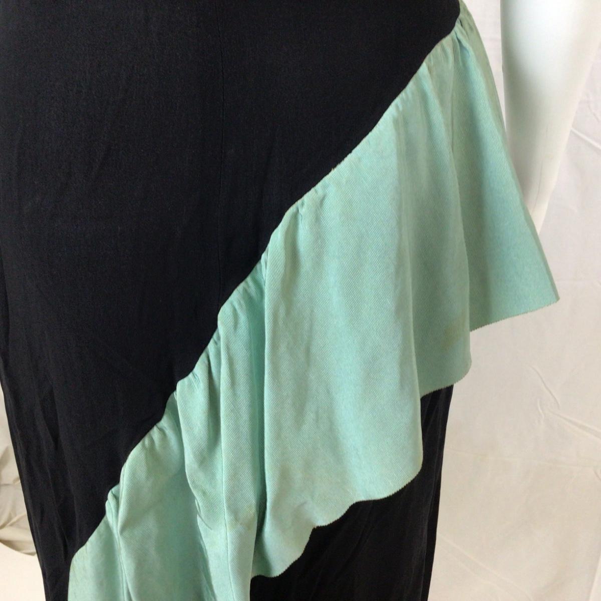 Vintage Black Crepe Dress with Mint grosgrain ribbon green ruffle from waist to hem. There are spots of discoloration on the green ribbon accents. The dress measures: 15” from armpit to armpit, 14” shoulder to shoulder, 56” overall length, 25” waist. Ben J. Gam is designer and was active during the 1940's -1950's and his daughter was Rita Gam and she dressed Grace Kelly. The label died when he passed in 1956
