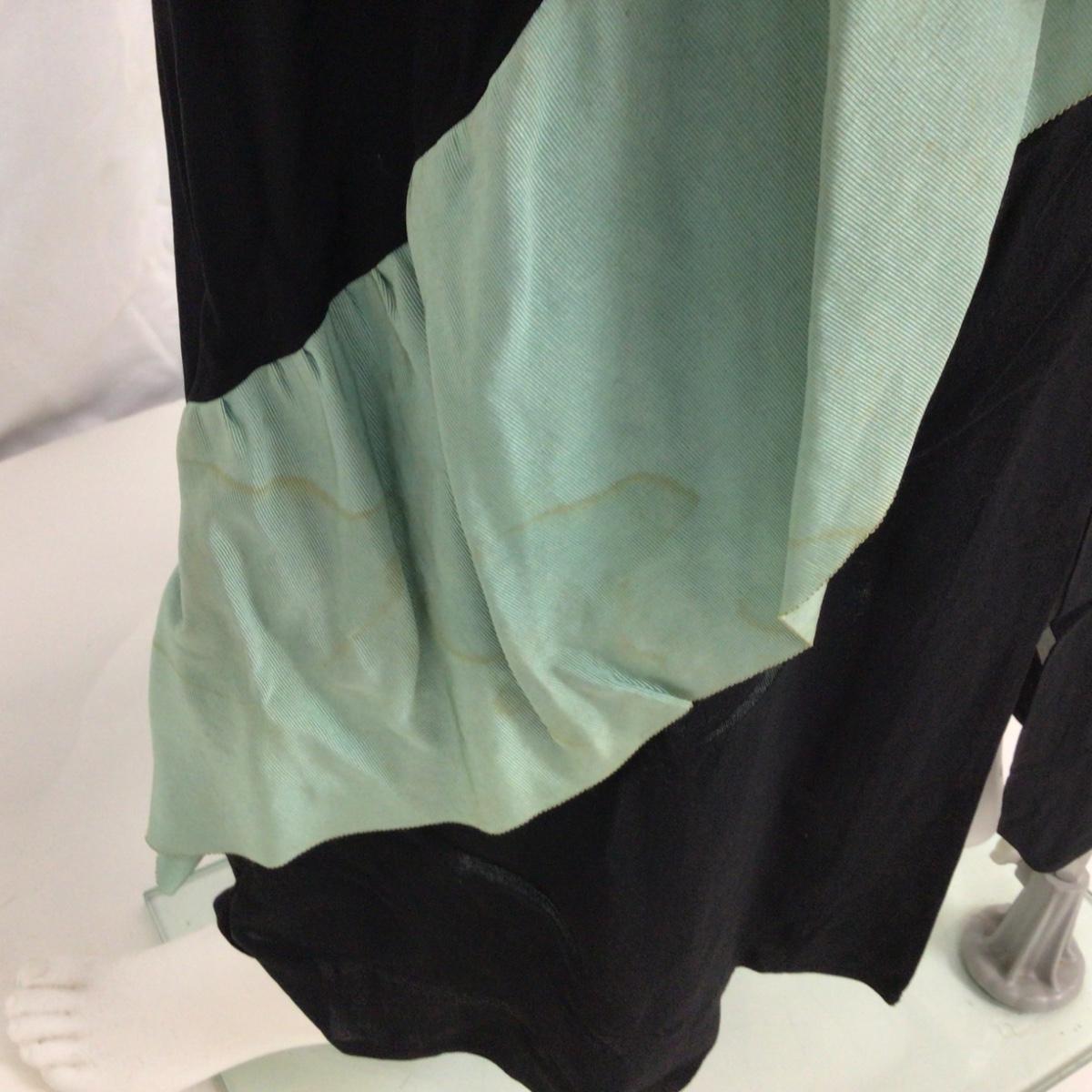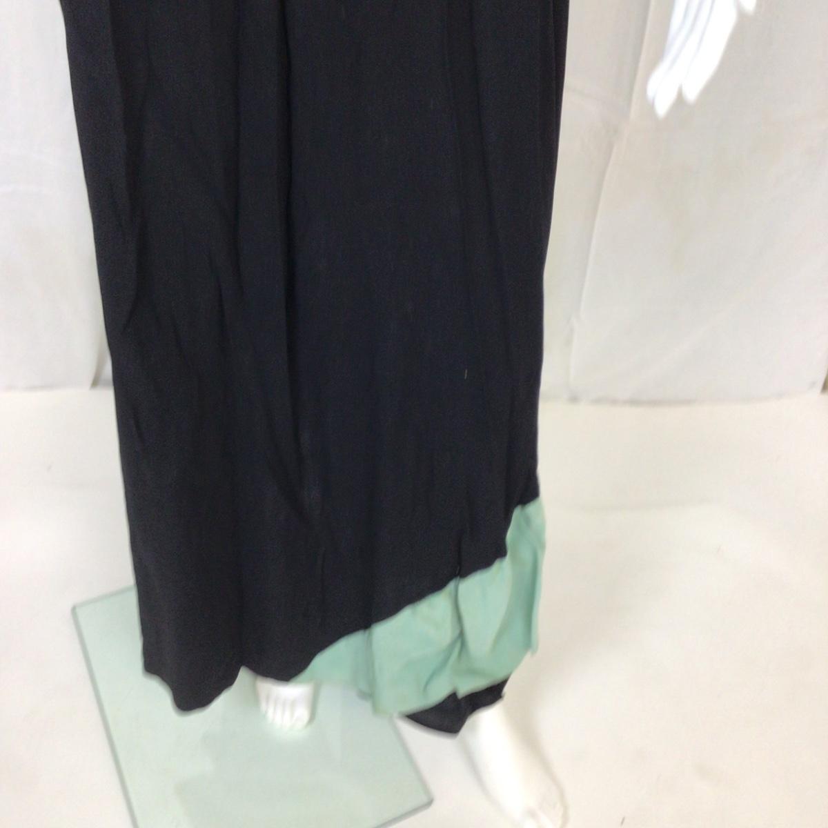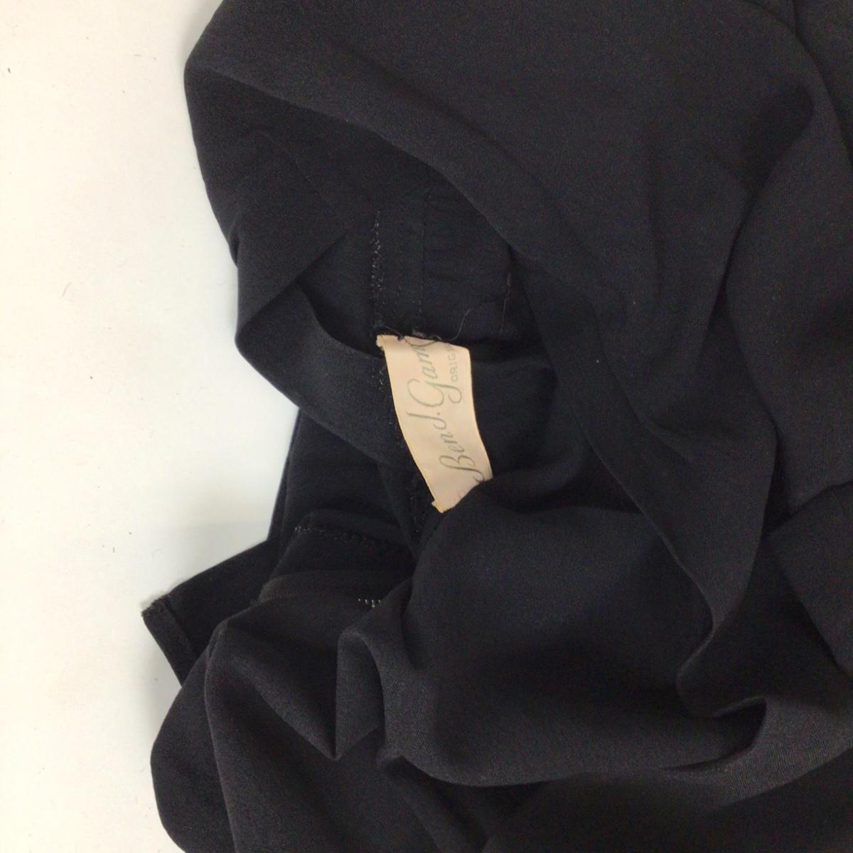 Vintage Black Crepe Dress with Mint grosgrain ribbon green ruffle from waist to hem. There are spots of discoloration on the green ribbon accents. The dress measures: 15” from armpit to armpit, 14” shoulder to shoulder, 56” overall length, 25” waist. Ben J. Gam is designer and was active during the 1940's -1950's and his daughter was Rita Gam and she dressed Grace Kelly. The label died when he passed in 1956