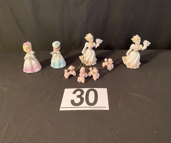 Porcelain dolls. One has attached poodles. Estimated weight of lot: 5lbs. Measurement: 5"H x 3"W (largest)