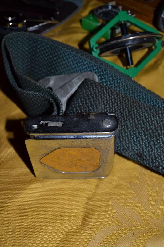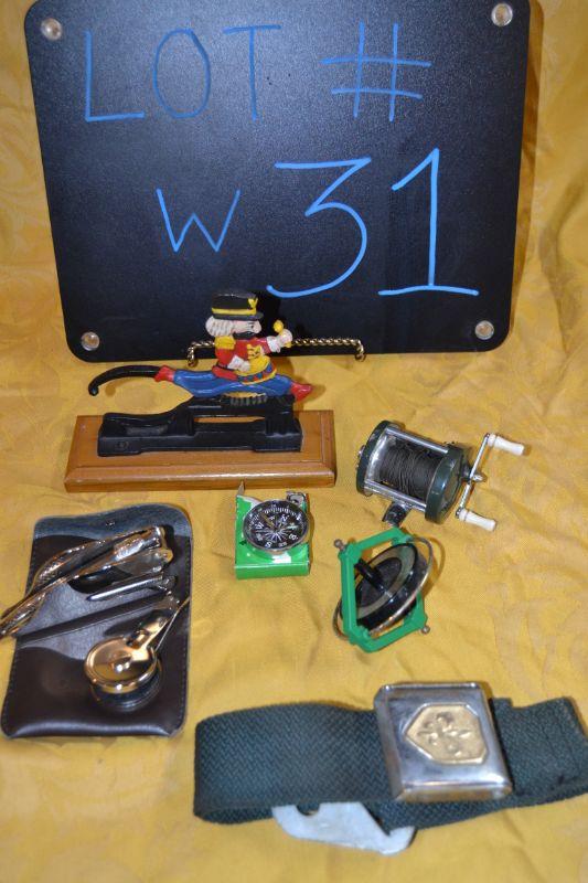 Gizmos and gadgets. Vintage Fishing Reel, Notary Stamp, Military Buckle, Compass, and a Nutcracker. This is a Suite deal.