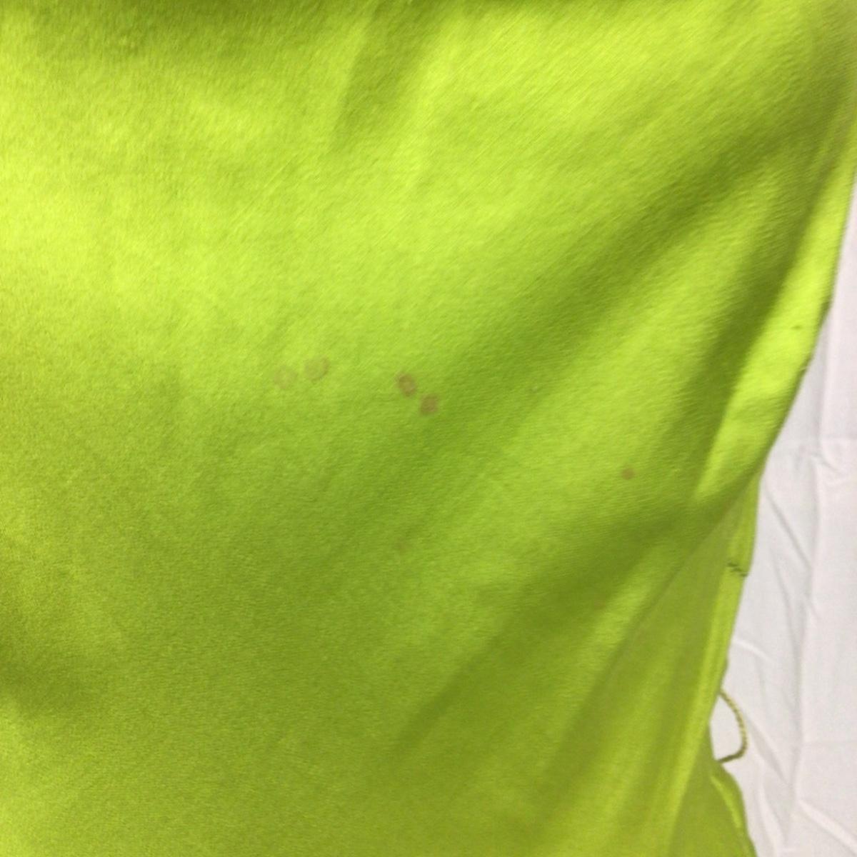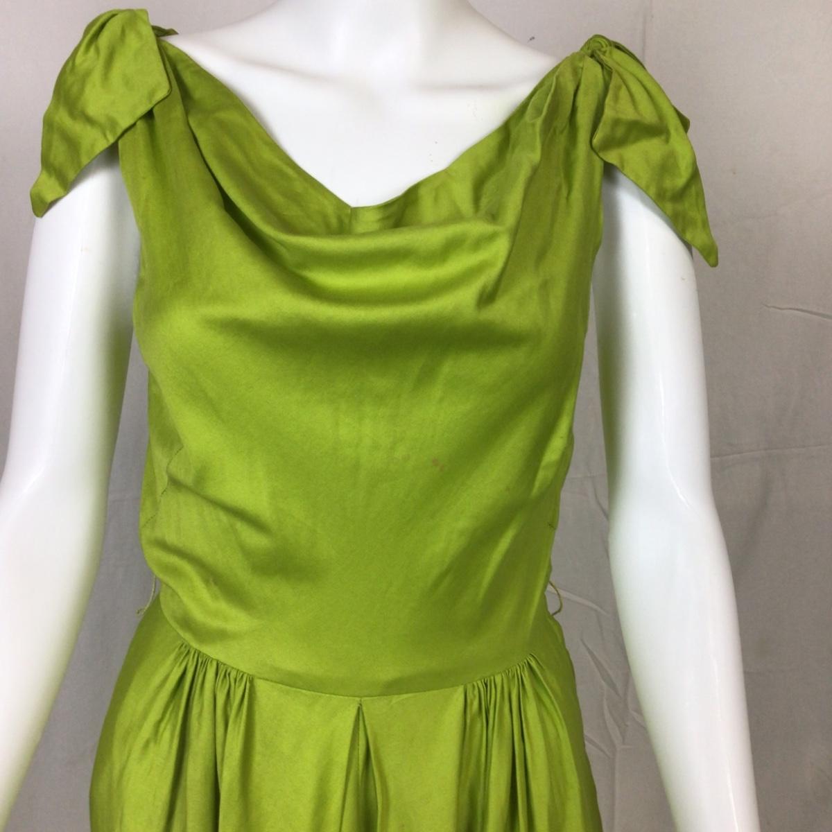 Sleeveless dress has some small spots of discoloration from age and storage. The dress measures 17” from shoulder to shoulder, 24” from armpit to armpit, 45” overall length and the waist is 24”.