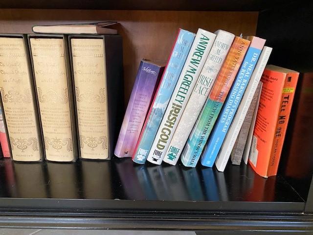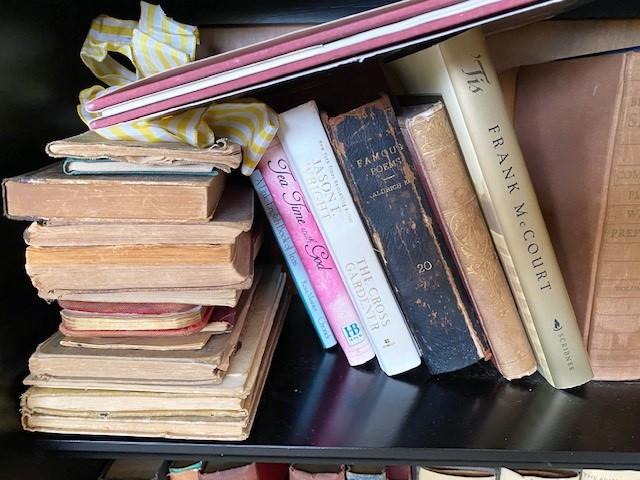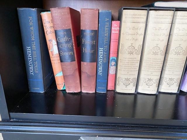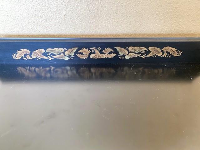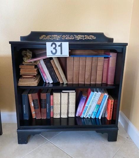 Black bookshelf with painted accents. Includes antique and contemporary books. Measurement: 30 1/2"W x 33"H x 11 1/2"D