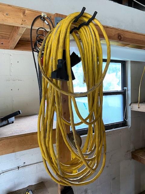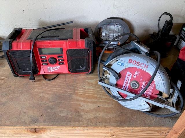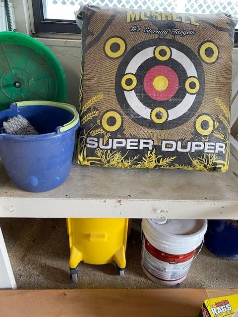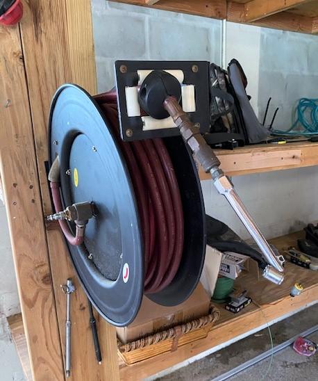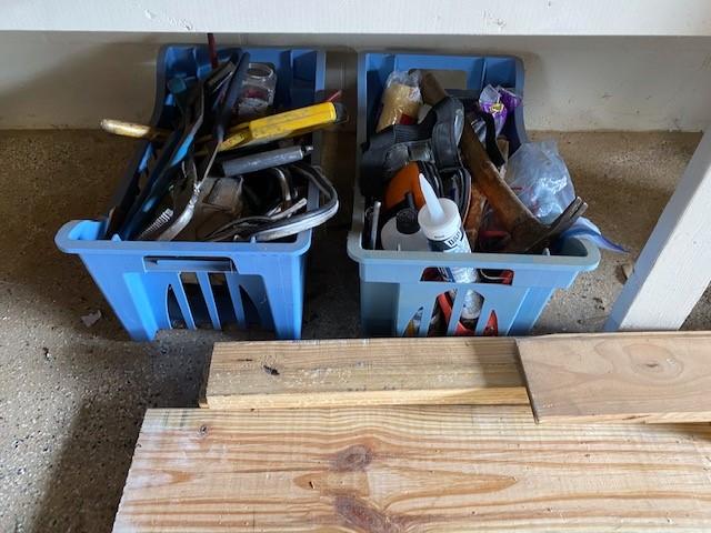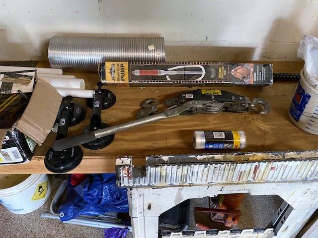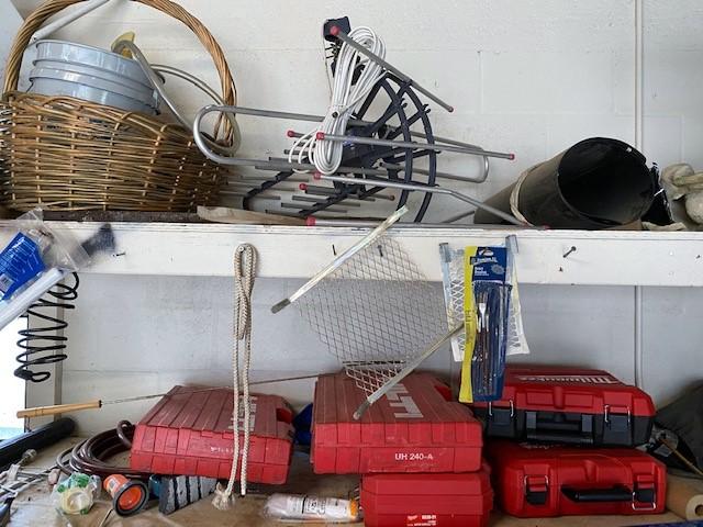 Includes assorted corded power tools, wheelbarrow, fasteners, hose reel, organizers, animal traps, PVC fittings, come along, bottle jack, lumber, folding chairs, extension cords, tarps, saw horses, archery target, gas cans, and more. Winning bidder must take all items in lot. Hilti and Milwaukee cases are empty.