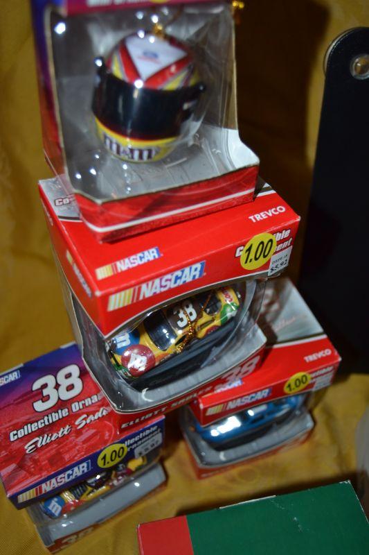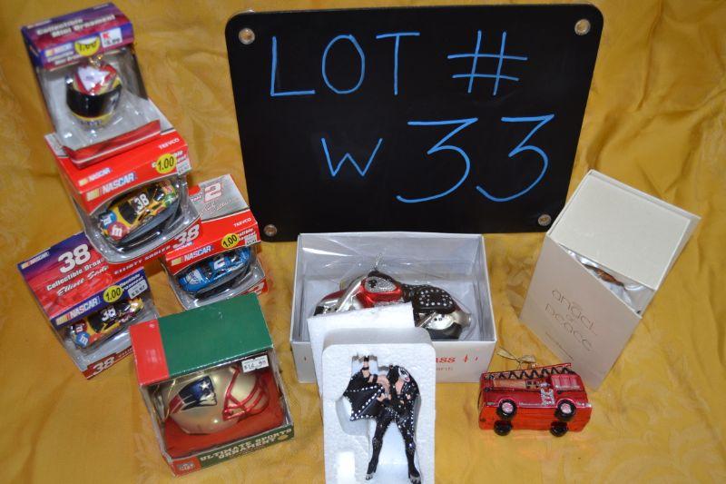 4 Nascar ornaments (+free stocking), Fire engine, Motorcycle, New England Patriots helmet, Angel, and Kiss! Gene Simmons requests you hang him on mistletoe!