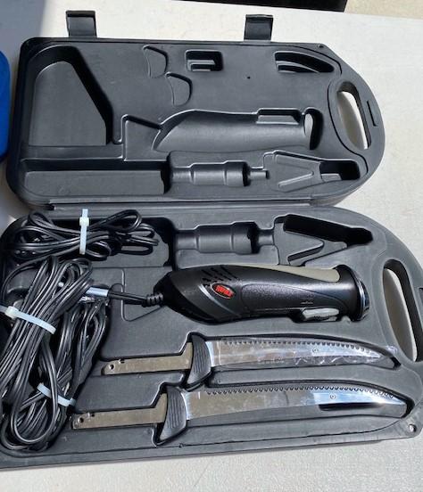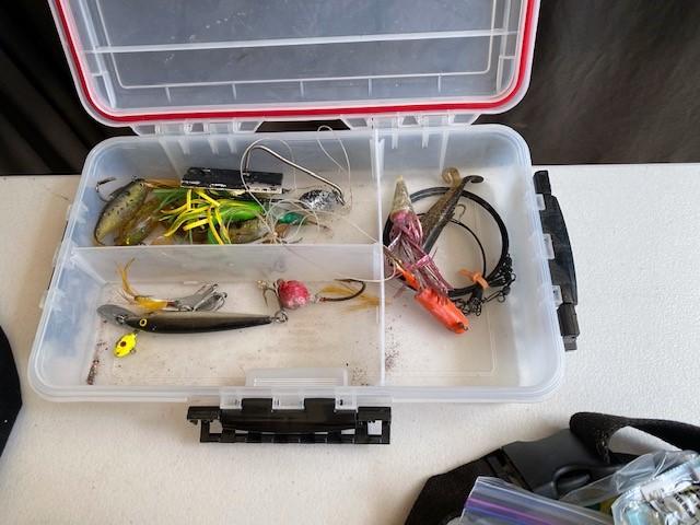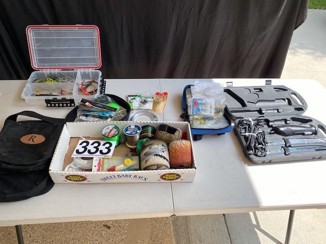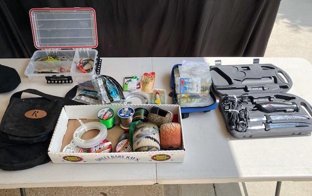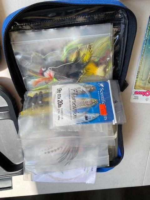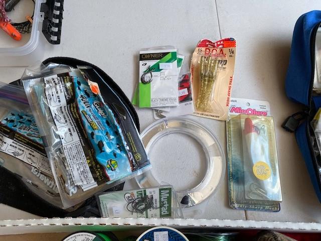 Includes Rapala electric knife, assorted soft baits, fishing line, neoprene reel covers, saltwater flies, and more.