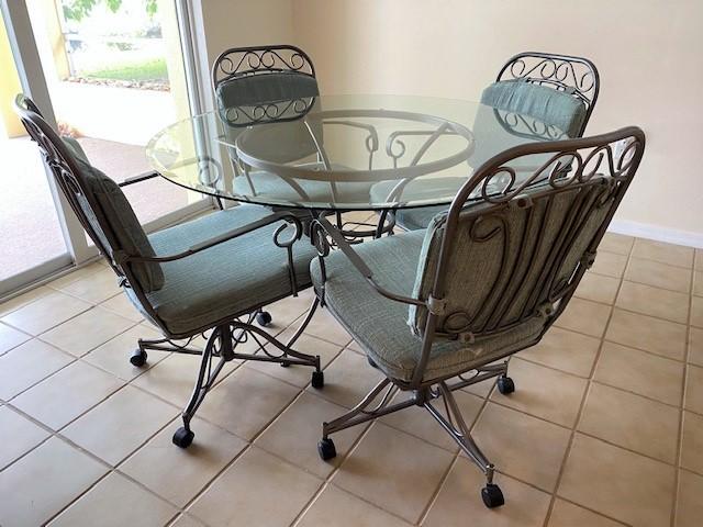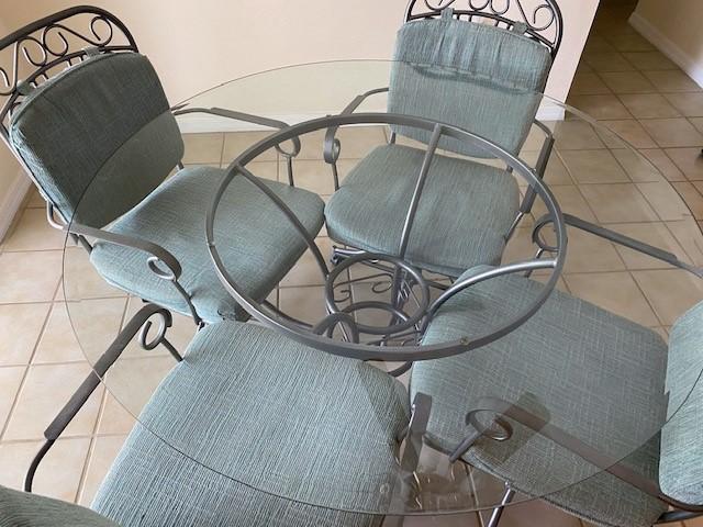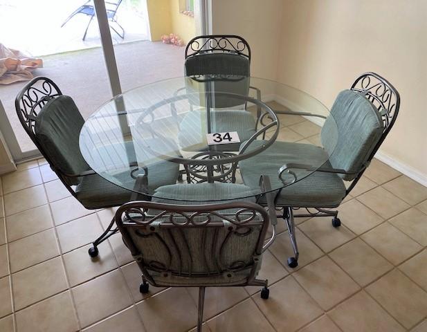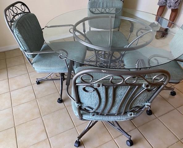 Glass top table. Metal pedestal and chairs. Chairs swivel and are on casters. Measurement: Table: 48" Diameter