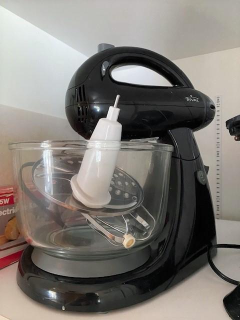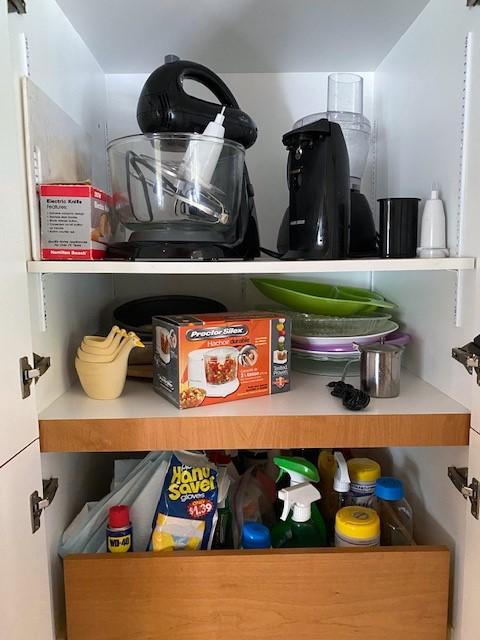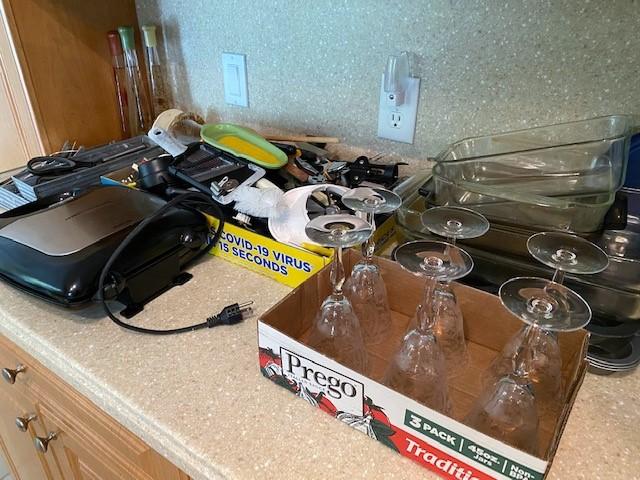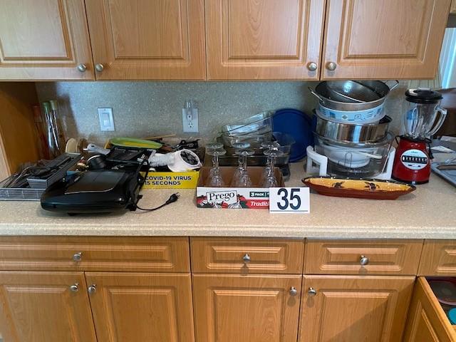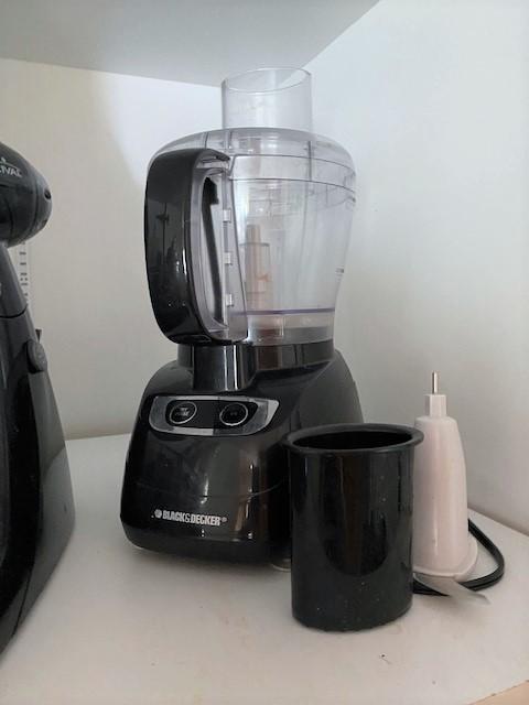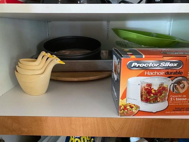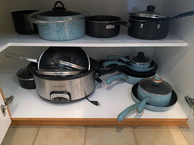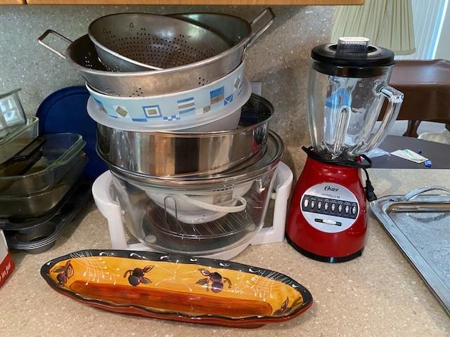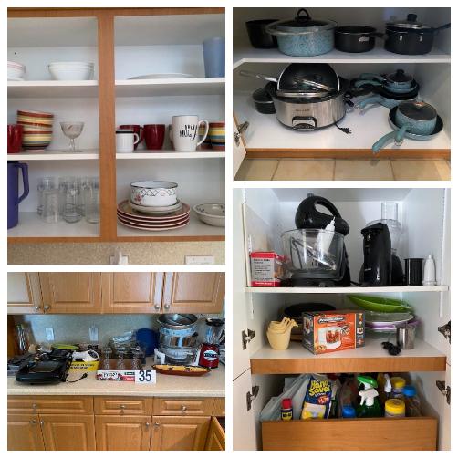 Includes Oster blender, indoor grill, Paula Deen cookware, crock pot, kitchen storage, Mainstays dinnerware, Rival mixer, Black and Decker food processor, electric knife, and more. Keys and cleaning products NOT included. Winning bidder MUST take ALL items in lot.
