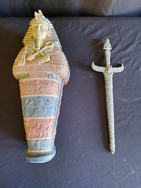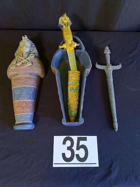 Includes two daggers. One dagger is inside a sarcophagus. Measurement: 14"L x 6"W (largest)