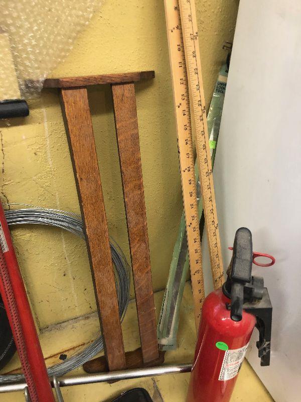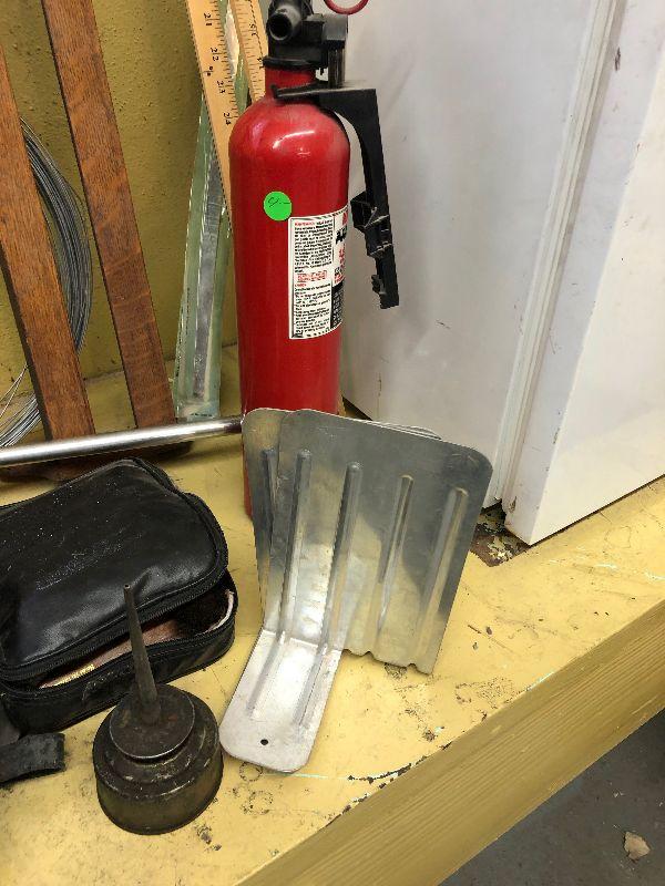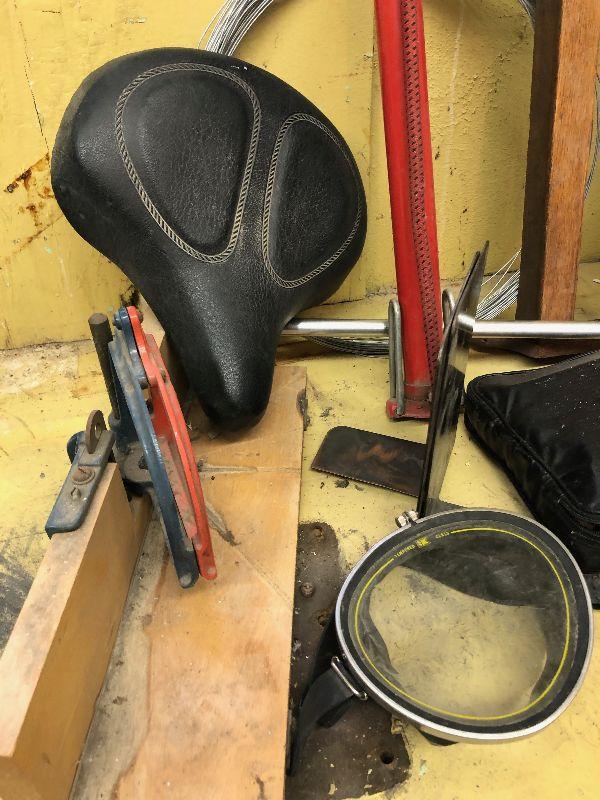 Lot#385 Pile of bike things, miter saw, fire extinguisher, seat