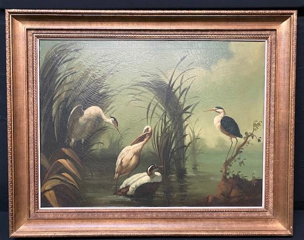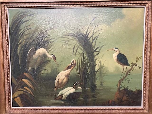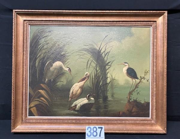LOT#387: Ira Monte Stork & Swan Oil on Canvas