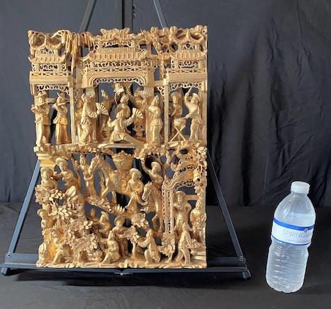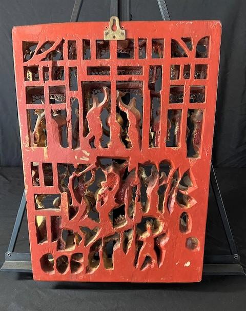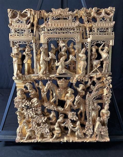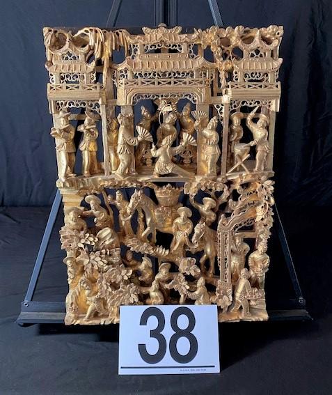 According to appraisal: "Gold leaf temple carving depicting men with horses, musicians & actors." Estimated weight of lot: 5lbs. Measurement: 12" x 16 1/2"