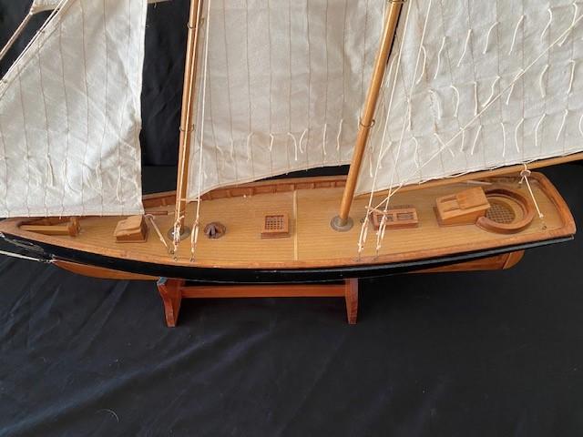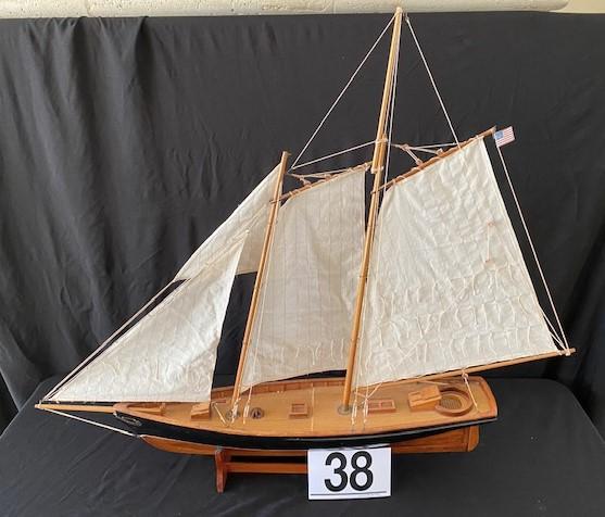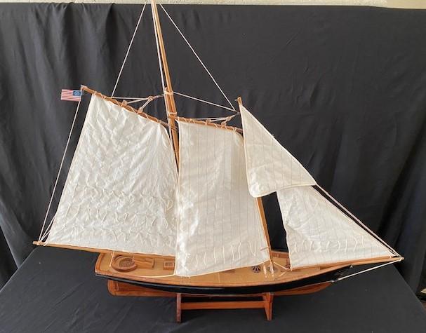 Four sails. Rigging appears to be complete. Moveable rudder. Estimated weight of lot: 2 lbs. Measurement: 31"H x 38"L x 5"W