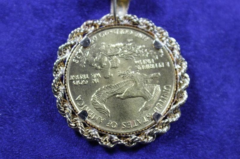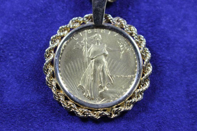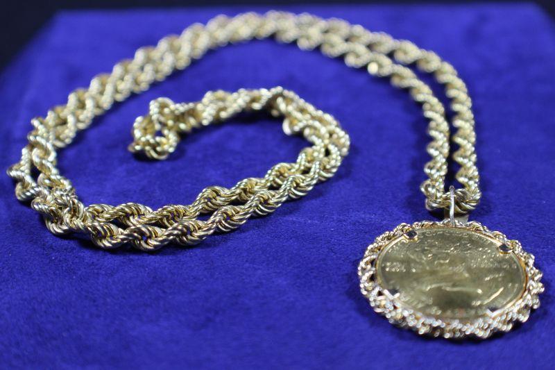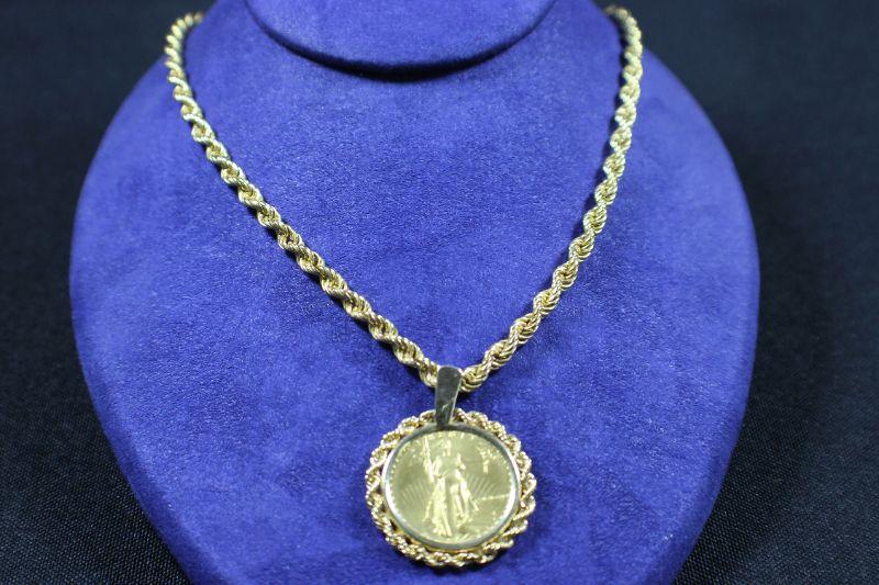 With a $10 Gold Piece Pendent confirmed with XRF to be 22K Gold. 24" chain.