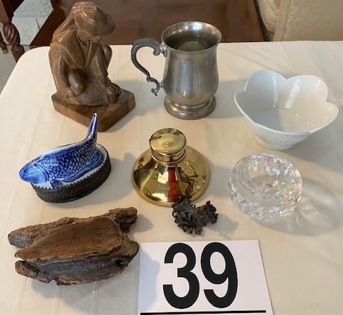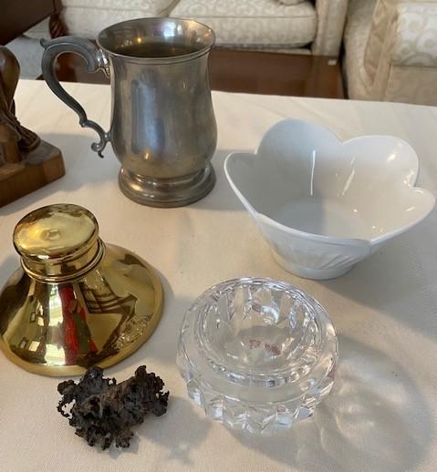 Includes: inkwell, fungi, floral bowl, pewter mug & crystal ashtray. Measurement: 8"H (tallest item)