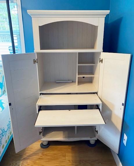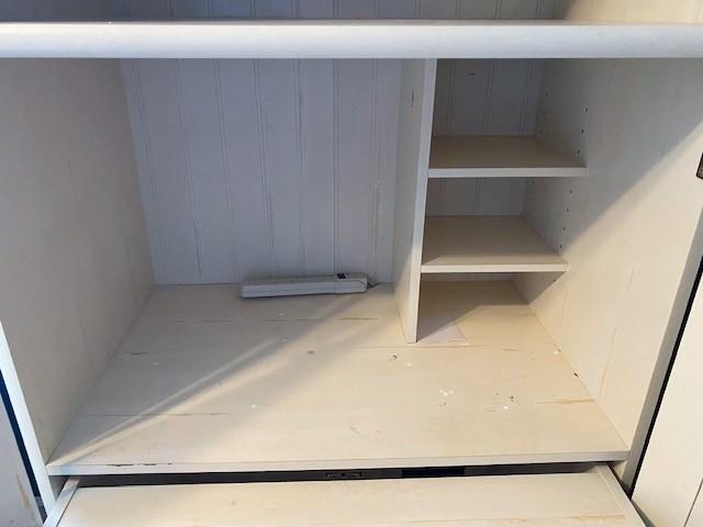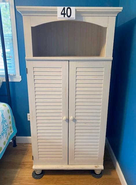 Antiqued. Plantation style doors. Some wear (pictured). Measurement: 68"H x 31"W x 21"D