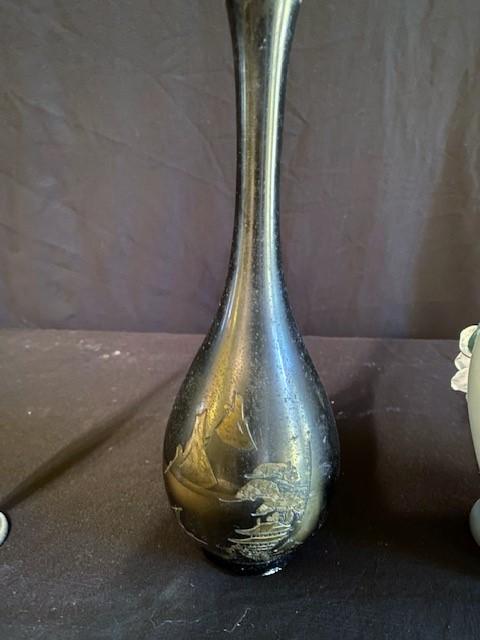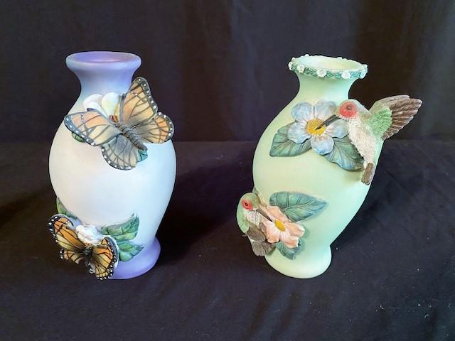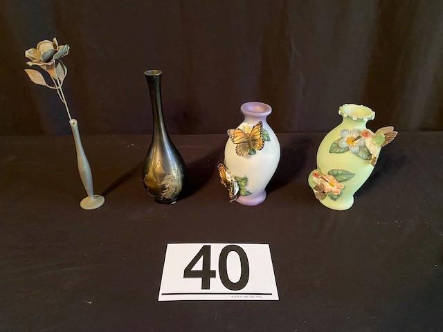 One brass and three ceramic. Two have birds and butterflies. One is made in Japan. Measurement: 10"H (tallest) x 4"W (widest)