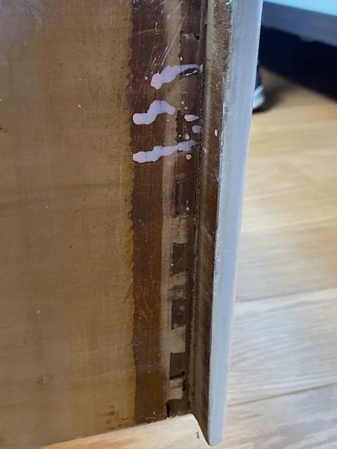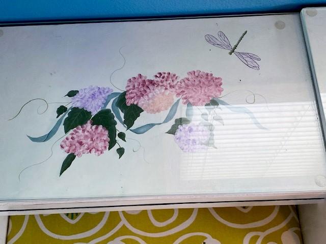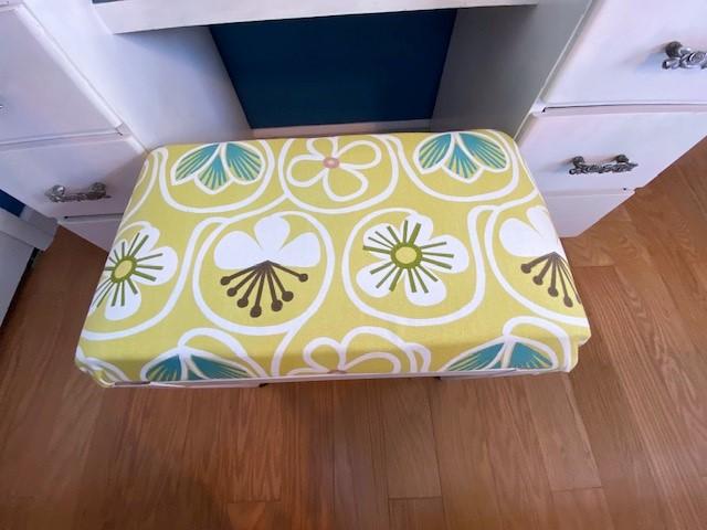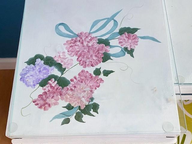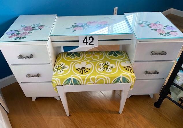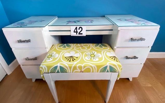 Has glass inserts. Six drawers. Has been painted. Includes stool. Measurement: 50"W x 27"H x 19"D (vanity)