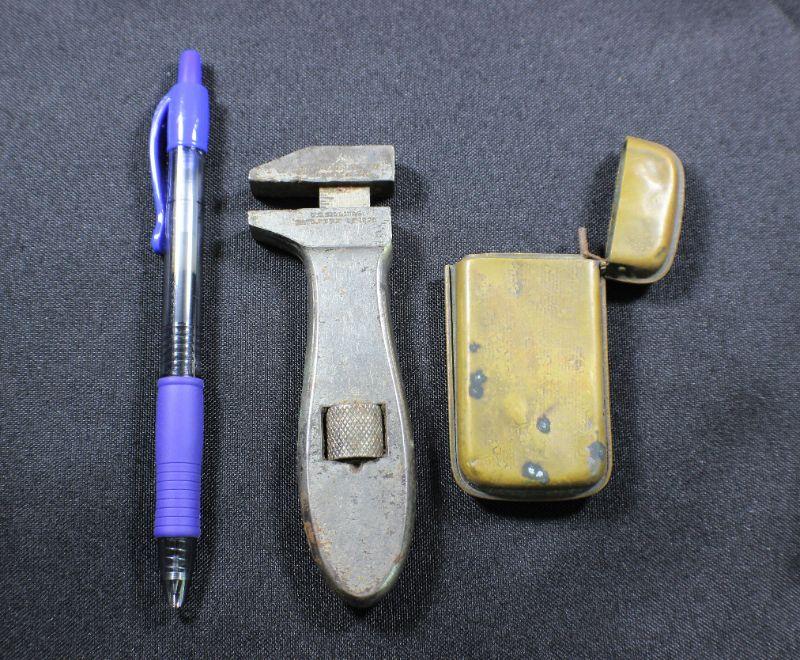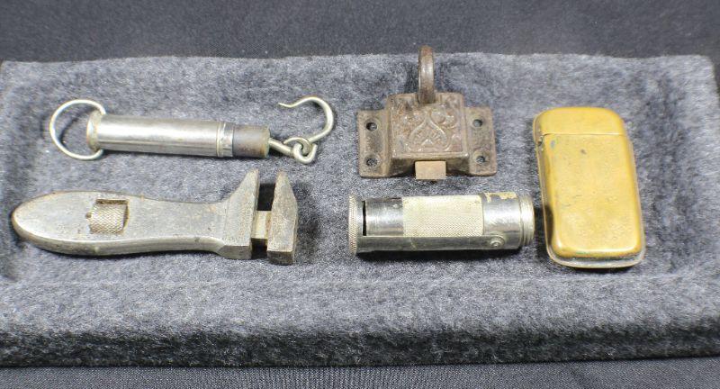 Includes: a copper match safe, an aluminum match safe, a mortoise, gravity scale & milling tool. Measurements: Longest = 4 1/2"